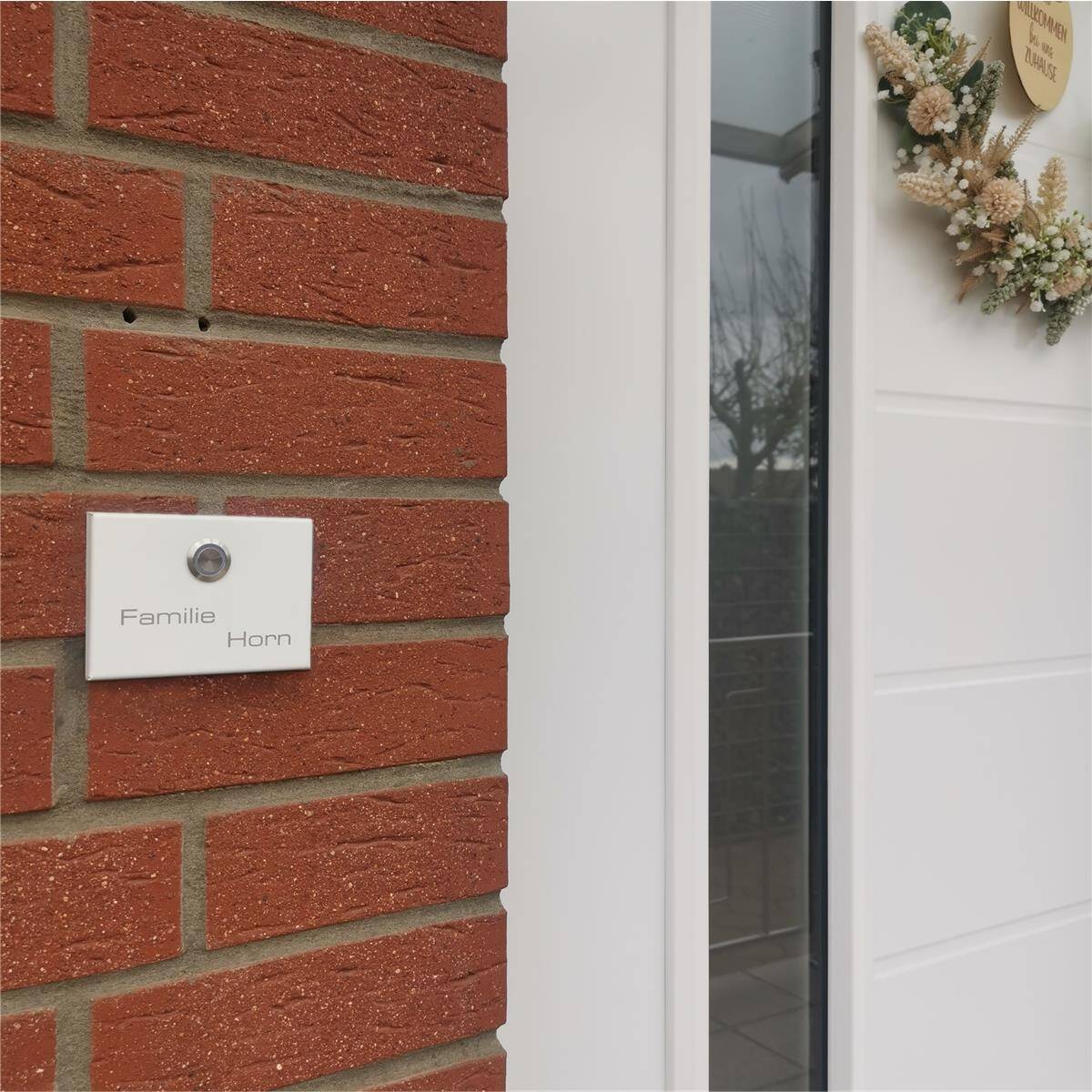 La piastra del campanello massiccia è realizzata in acciaio inox con un rivestimento a polvere aggiuntivo in colore Bianco. Questo rende la targa assolutamente resistente alle intemperie, facile da pulire e durevole.