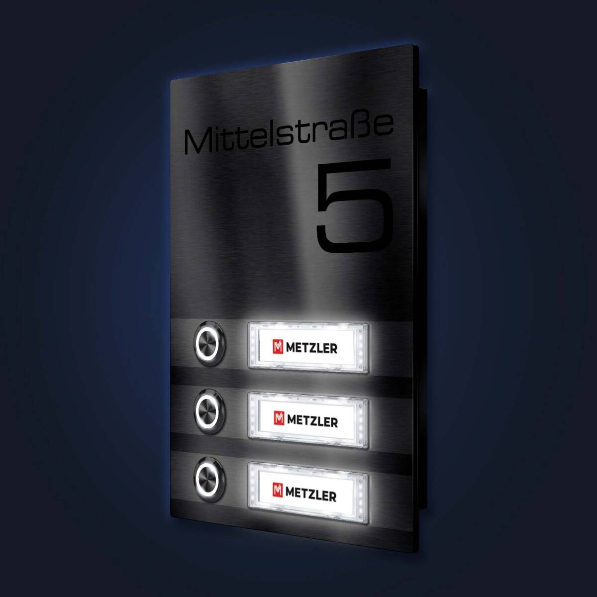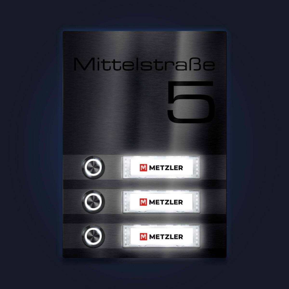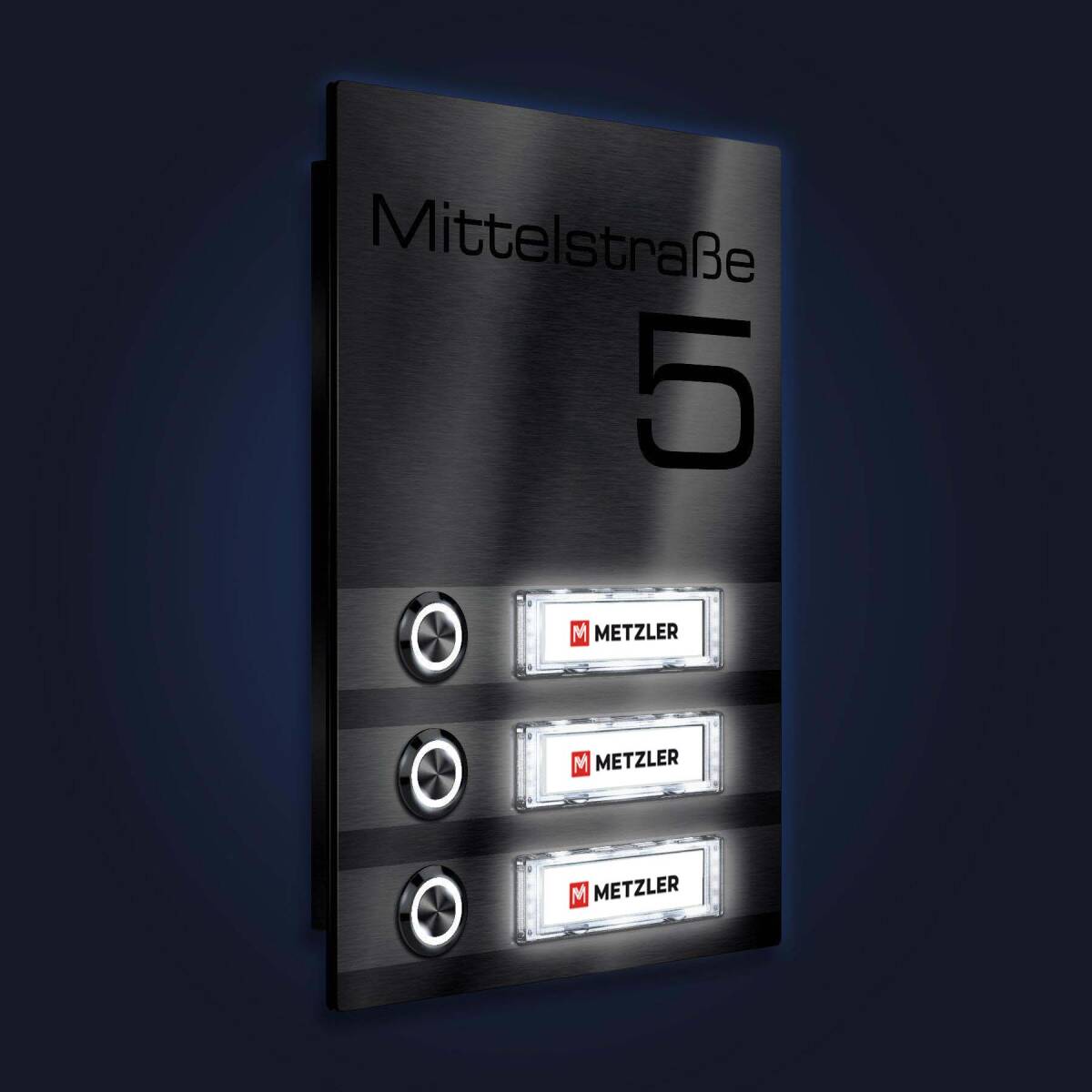 Le tre targhette nominative sono particolarmente pratiche, poiché possono essere sostituite in qualsiasi momento. In caso di cambio inquilino o modifica del nome, è sufficiente sostituire la carta della targhetta, cosa che può essere fatta in un attimo grazie al sistema a scatto pratico. Per questo puoi facilmente utilizzare il nostro modello di stampa interattivo come PDF compilabile. Inoltre, puoi ordinare la targhetta opzionalmente con illuminazione a LED.