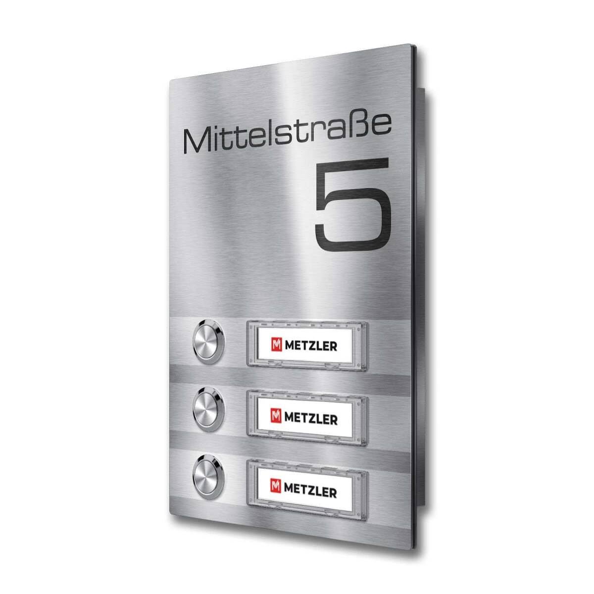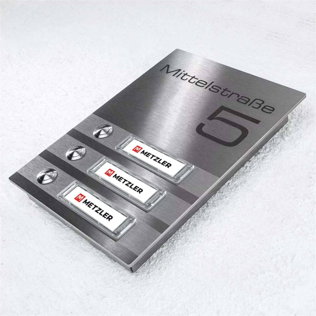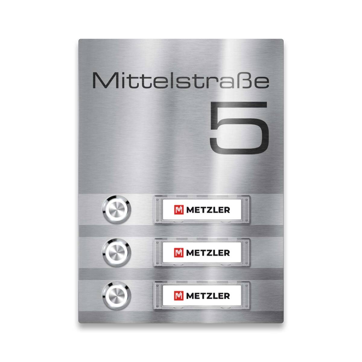 Le tre targhette nominative sono particolarmente pratiche, poiché possono essere sostituite in qualsiasi momento. In caso di cambio inquilino o modifica del nome, è sufficiente sostituire la carta della targhetta, cosa che può essere fatta in un attimo grazie al sistema a scatto pratico. Per questo puoi facilmente utilizzare il nostro modello di stampa interattivo come PDF compilabile. Inoltre, puoi ordinare la targhetta opzionalmente con illuminazione a LED.
