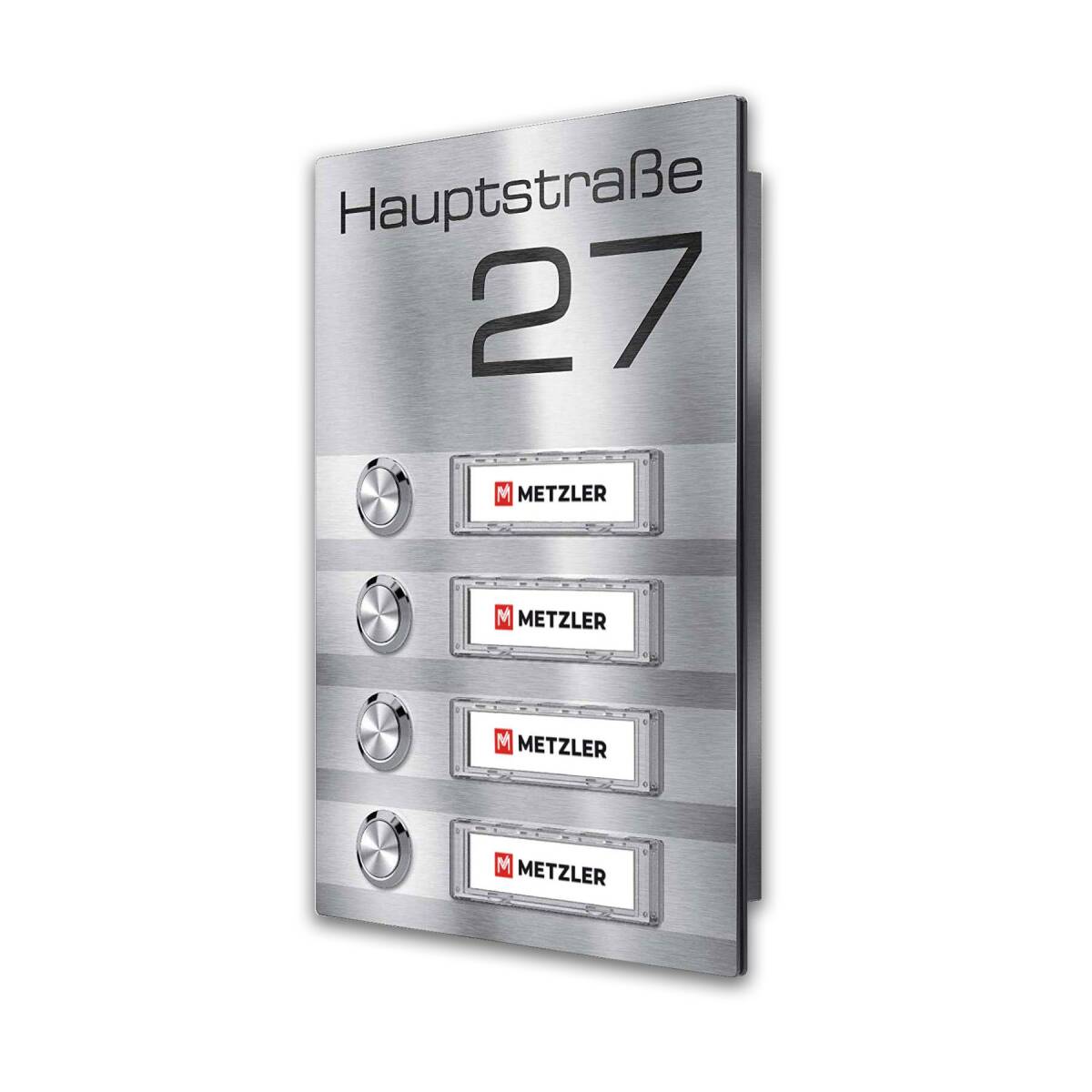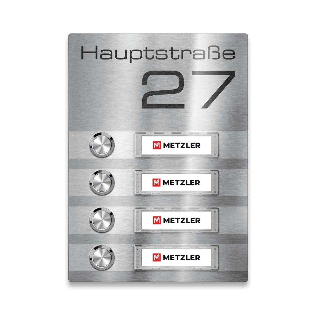 Il campanello si distingue inoltre per diversi punti di forza: per l'incisione elegante della vostra via e del numero civico, avete a disposizione 20 diversi caratteri. Le quattro targhette per nomi sono particolarmente pratiche, in quanto possono essere facilmente sostituite. In caso di cambio inquilino o modifica del nome, è sufficiente cambiare la carta della targhetta grazie al sistema a scatto pratico. Potete utilizzare il nostro modello di stampa interattivo come PDF compilabile.