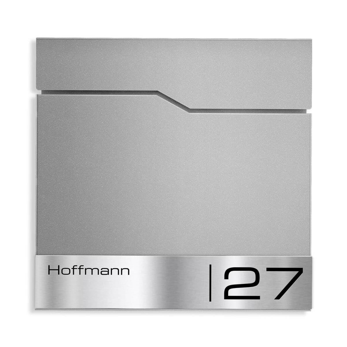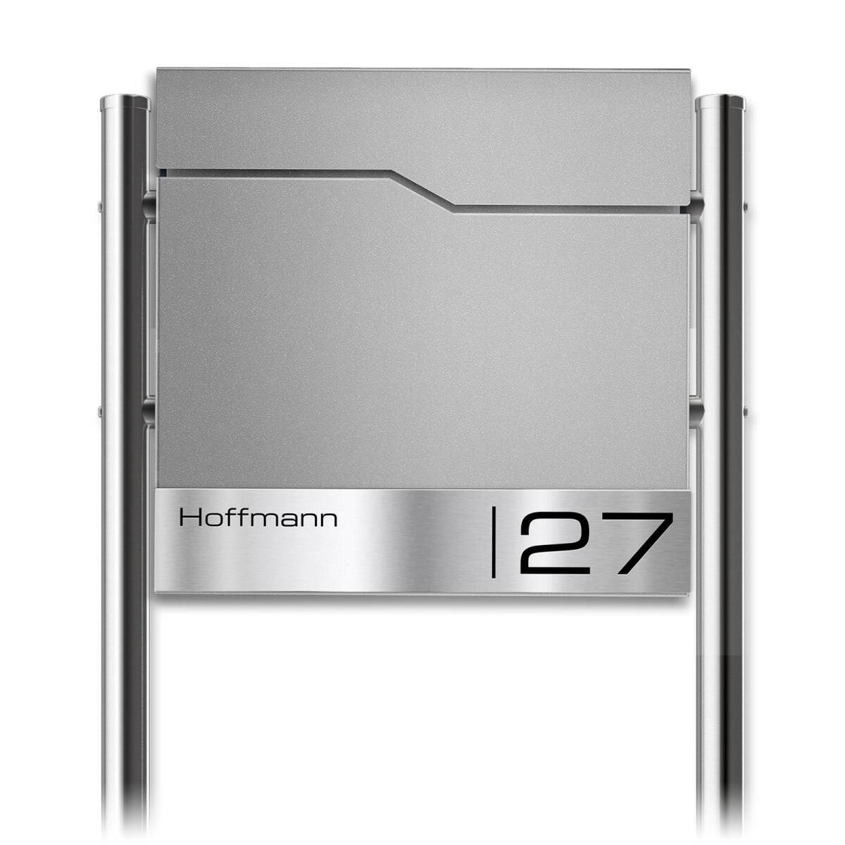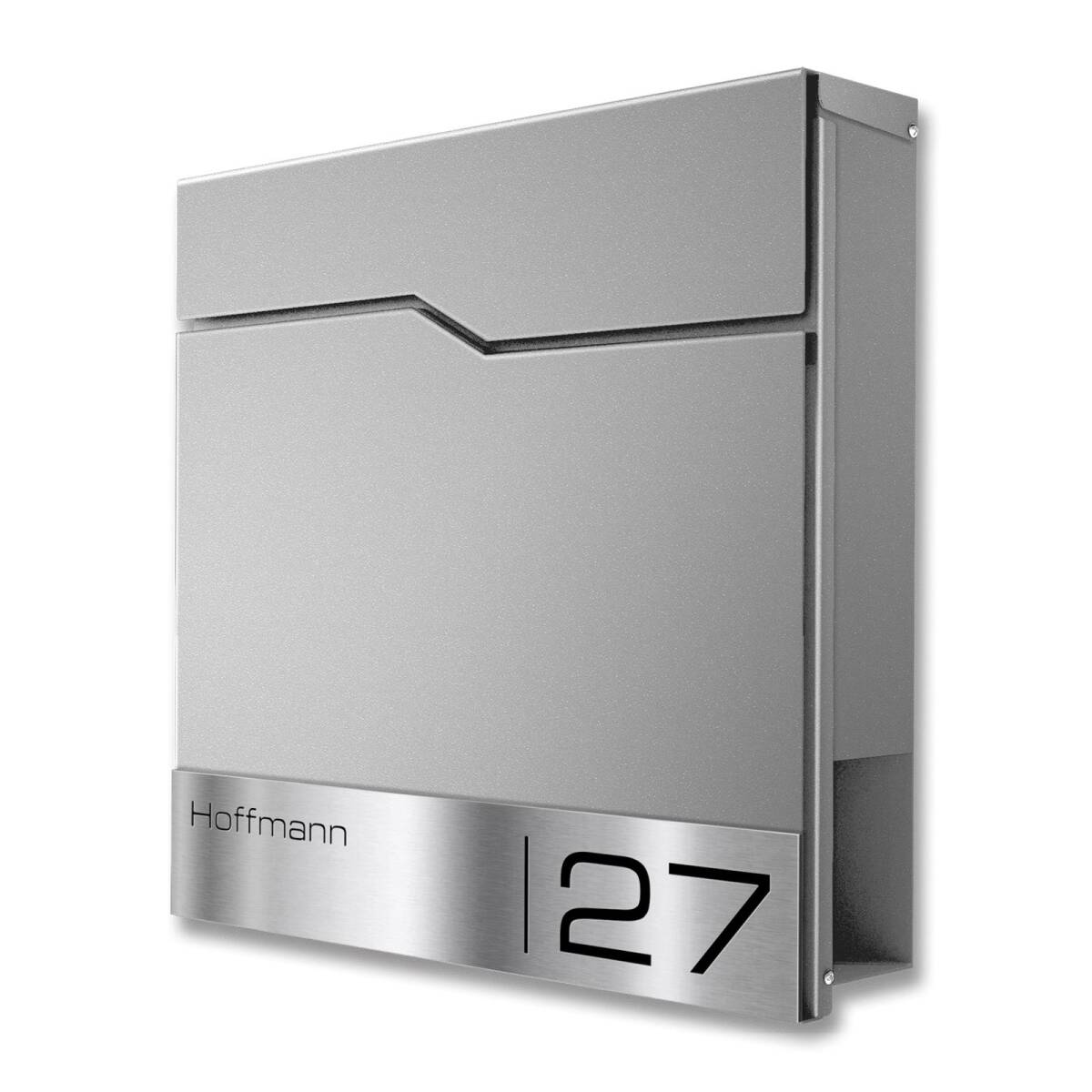 La cassetta della posta semplice ma elegante è realizzata in acciaio inossidabile V2A di alta qualità e antiruggine. La cassetta è arricchita da lastre di acciaio inossidabile con incisione laser. Per l'incisione è possibile scegliere tra diversi caratteri moderni. Per rendere la cassetta della posta ancora più resistente agli agenti atmosferici, la barra in acciaio inossidabile viene rivestita con una verniciatura a polvere alluminio grigio RAL 9007 dopo il taglio al laser. In questo modo, la cassetta della posta non teme né vento né intemperie.