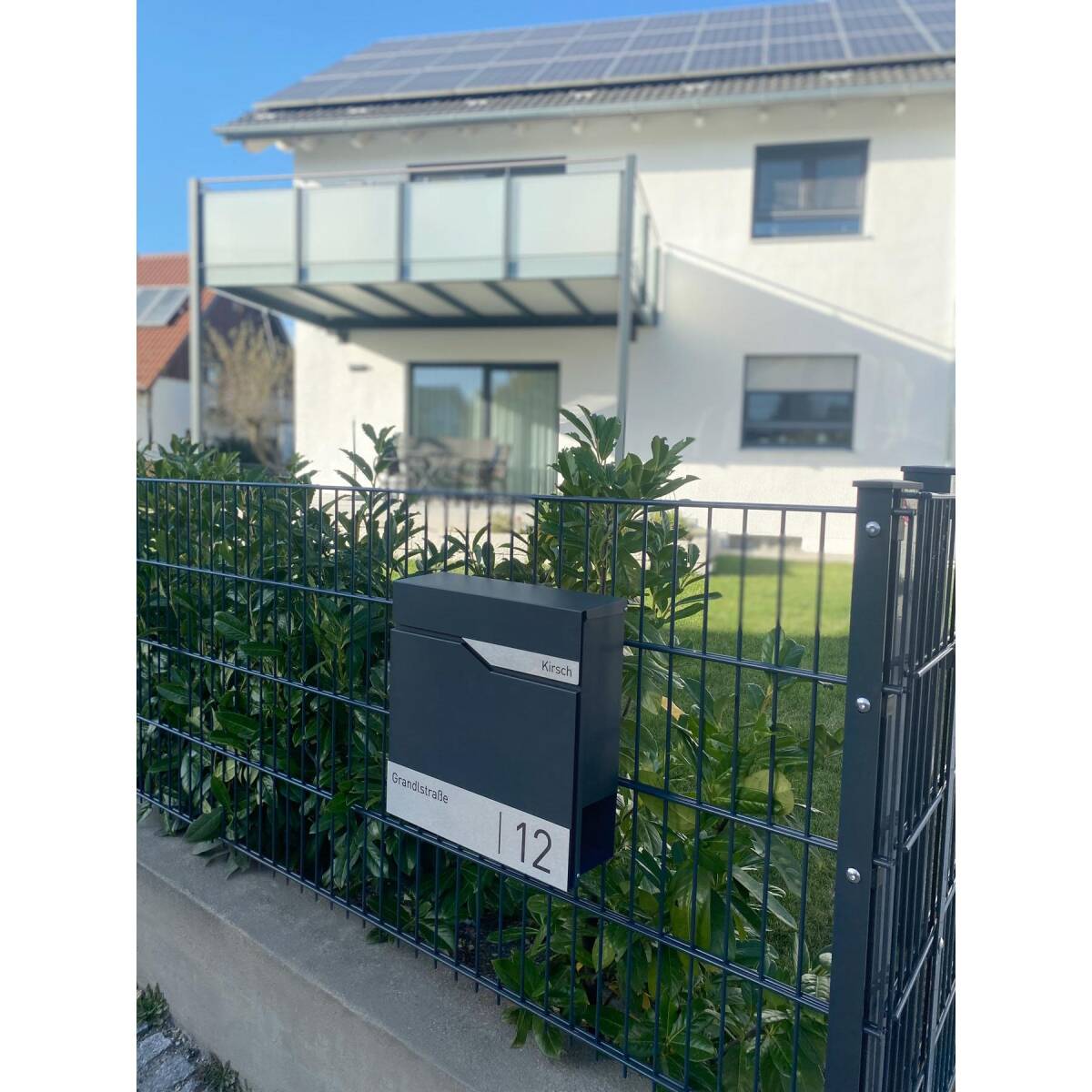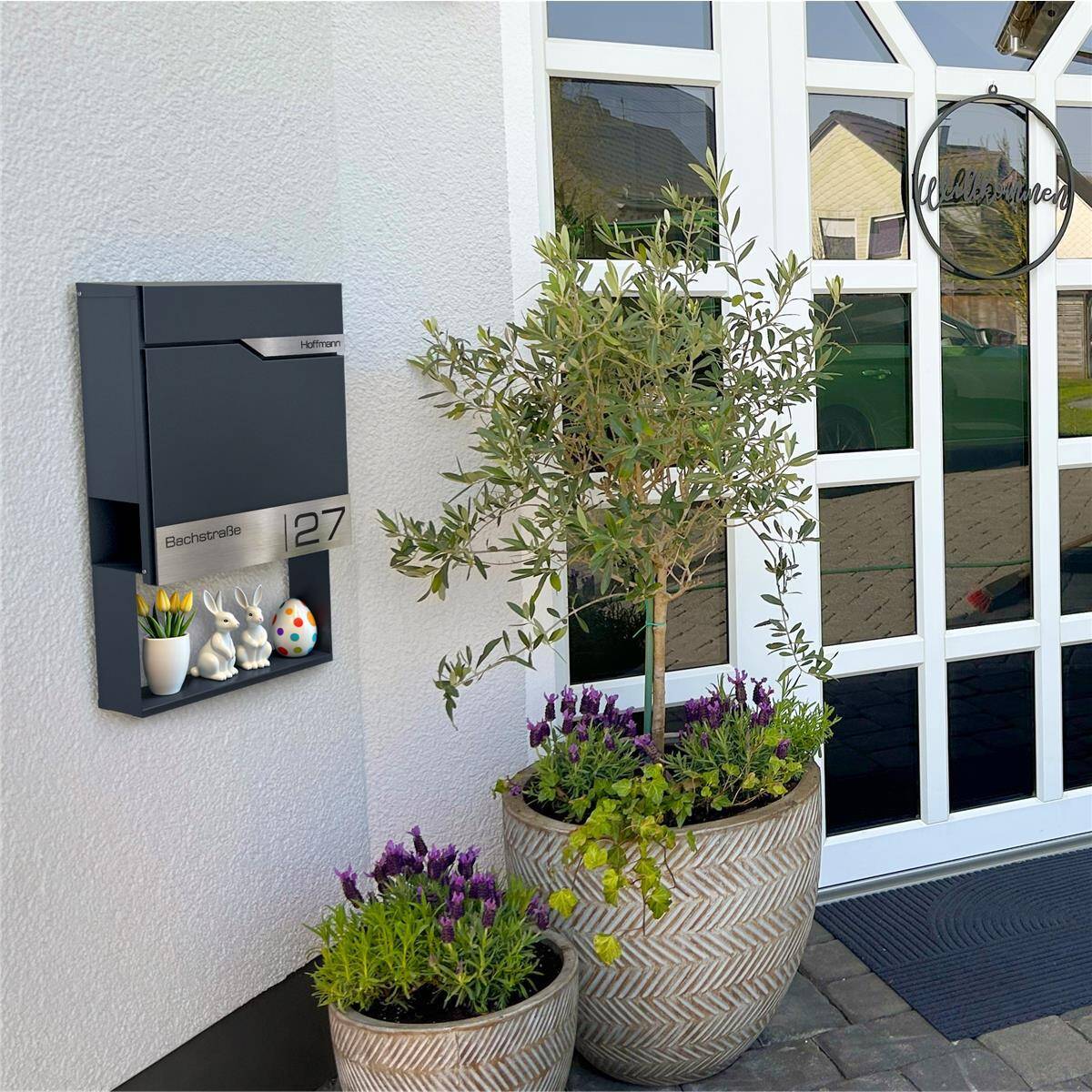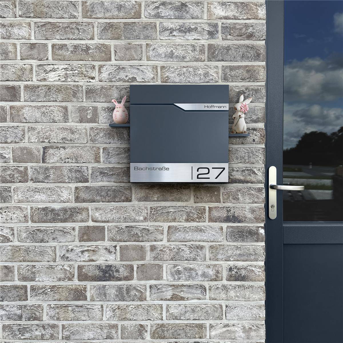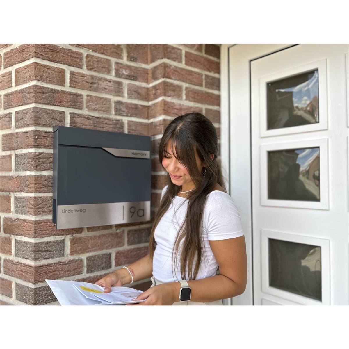 La cassetta delle lettere è realizzata in acciaio massiccio di alta qualità. Per rendere la cassetta ancora più resistente agli agenti atmosferici, l'acciaio viene rivestito a polvere in antracite RAL 7016 dopo il taglio laser di strada e numero civico. Così la cassetta delle lettere resiste a vento e intemperie.