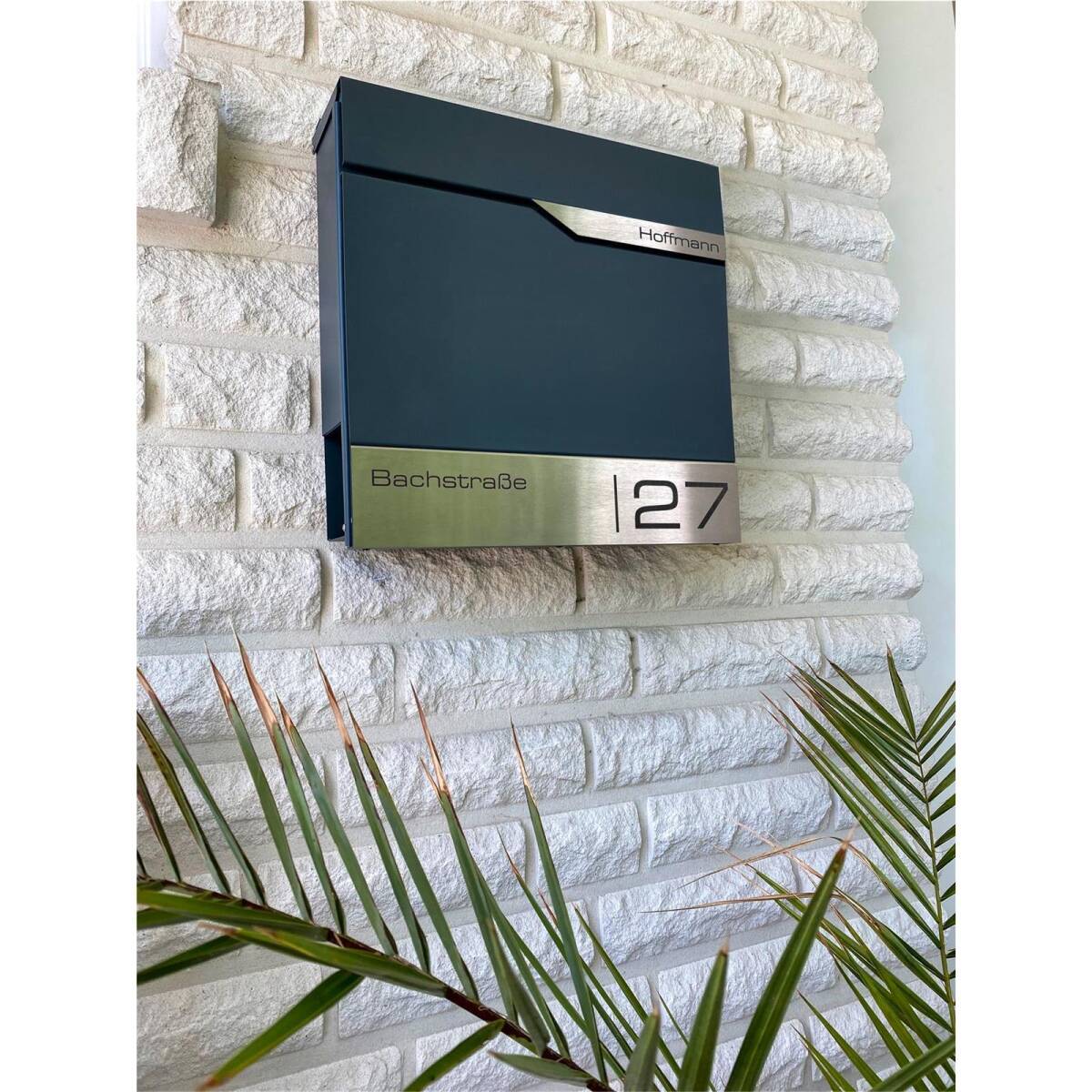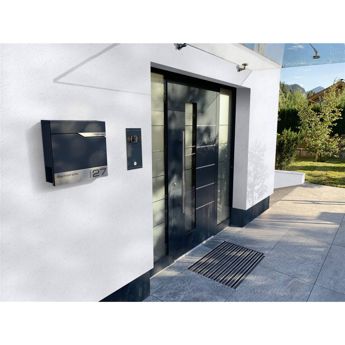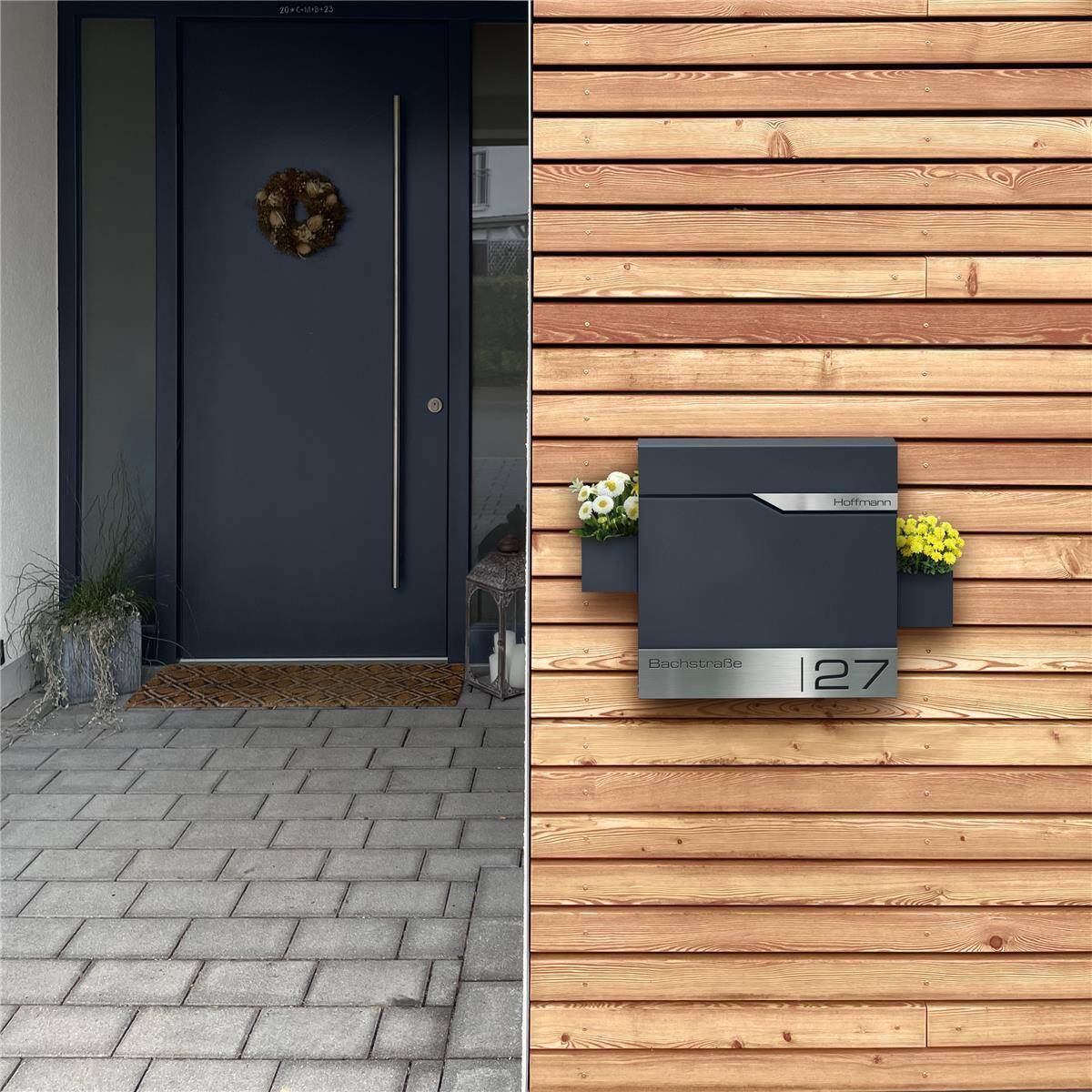La cassetta delle lettere è realizzata in acciaio massiccio di alta qualità. Per rendere la cassetta ancora più resistente agli agenti atmosferici, l'acciaio viene rivestito a polvere in antracite RAL 7016 dopo il taglio laser di strada e numero civico. Così la cassetta delle lettere resiste a vento e intemperie.