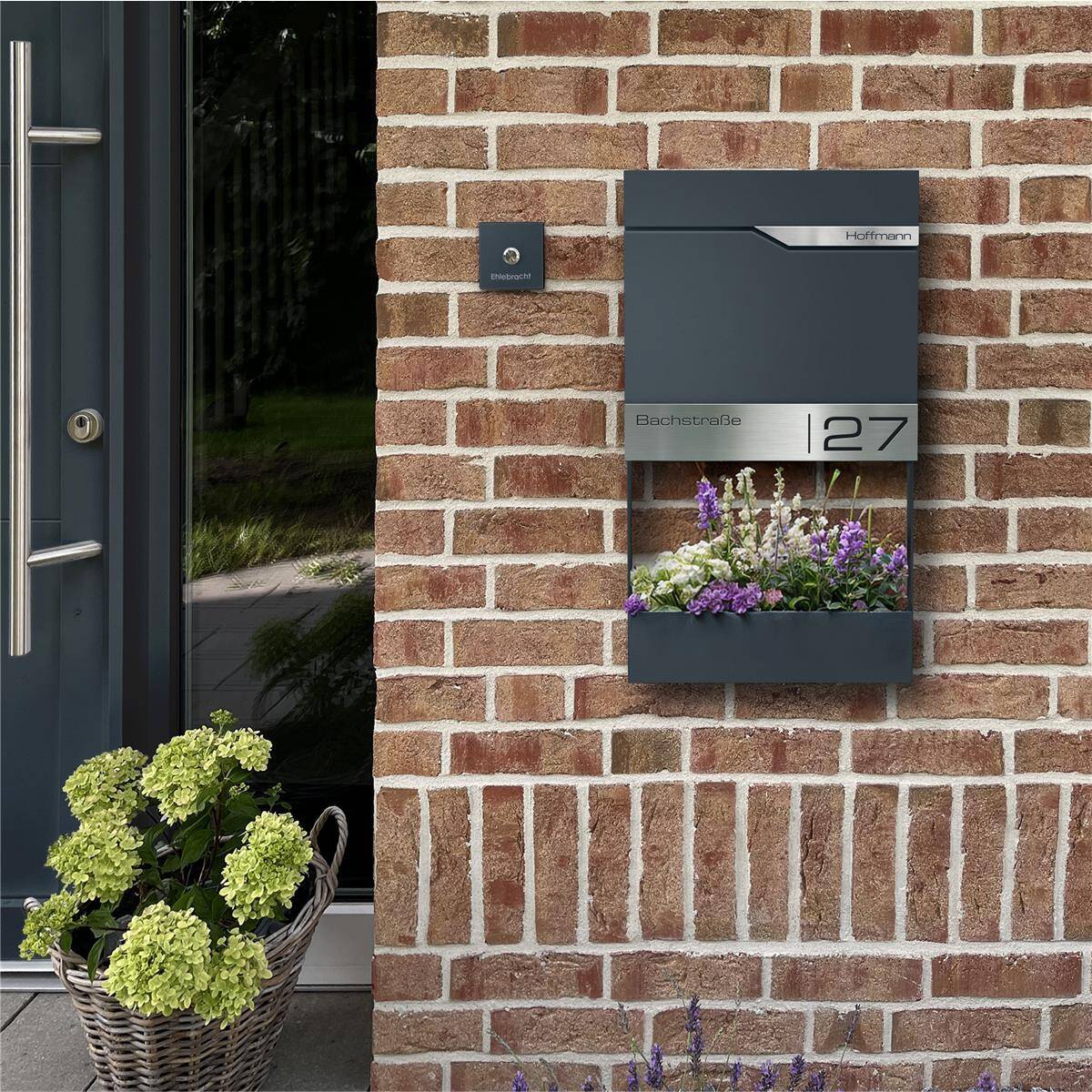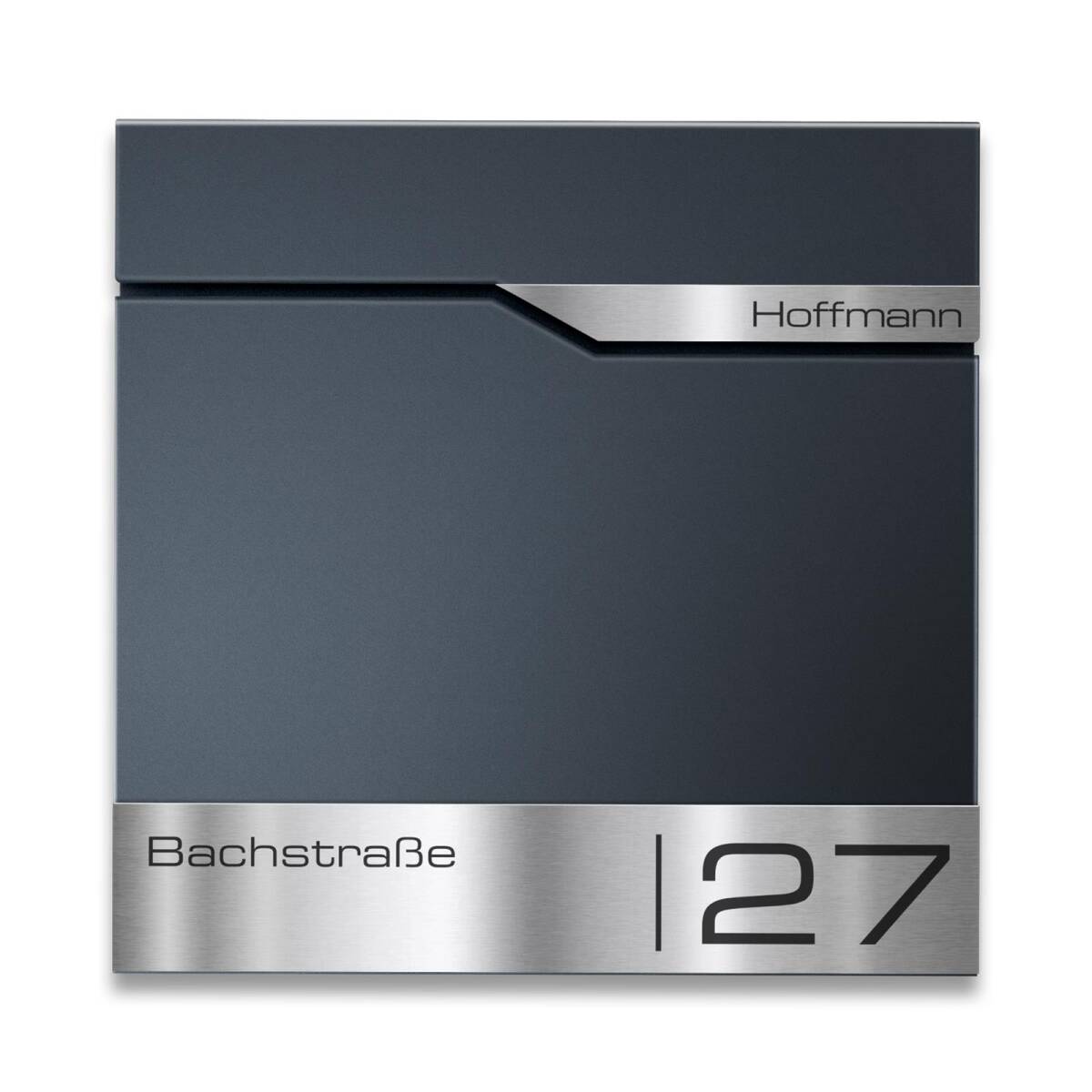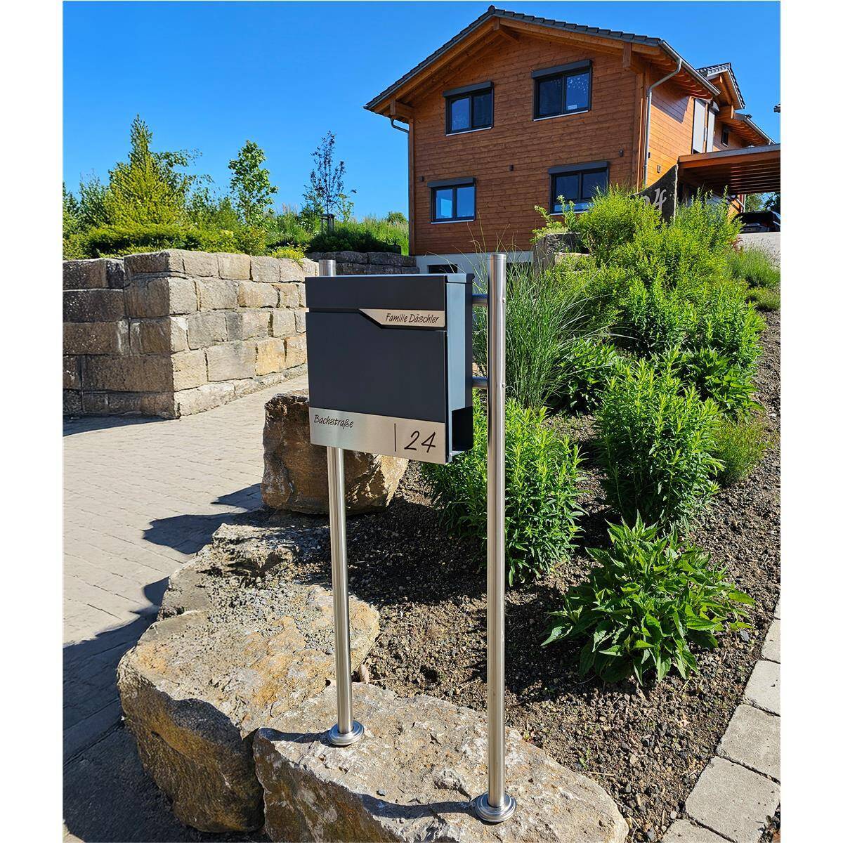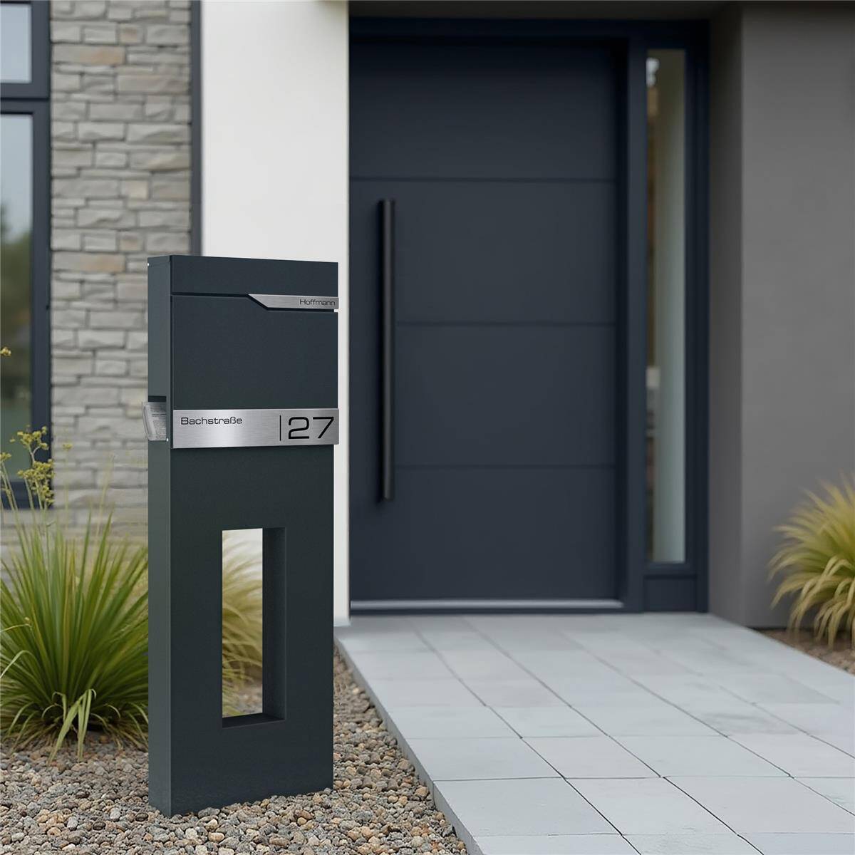 La cassetta delle lettere è realizzata in acciaio massiccio di alta qualità. Per rendere la cassetta ancora più resistente agli agenti atmosferici, l'acciaio viene rivestito a polvere in antracite RAL 7016 dopo il taglio laser di strada e numero civico. Così la cassetta delle lettere resiste a vento e intemperie.