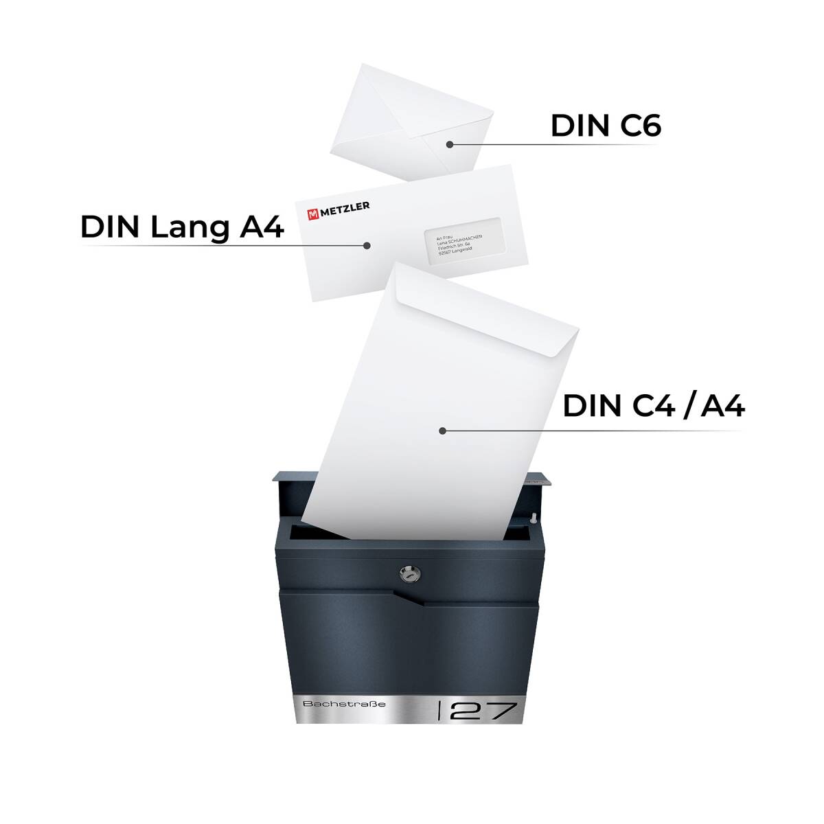 Particolarmente importanti in questo modello di cassetta sono le strisce di incisione in acciaio inox inossidabile. Sul pannello adesivo superiore puoi far incidere il tuo nome. La seconda lamiera in acciaio inox può essere personalizzata con il nome della strada e il numero civico. Puoi scegliere tra venti font selezionati e dare così un tocco personale alla tua cassetta delle lettere. E se ci fossero modifiche, la targhetta del nome può essere sostituita facilmente con quella di ricambio (numero articolo 28699).