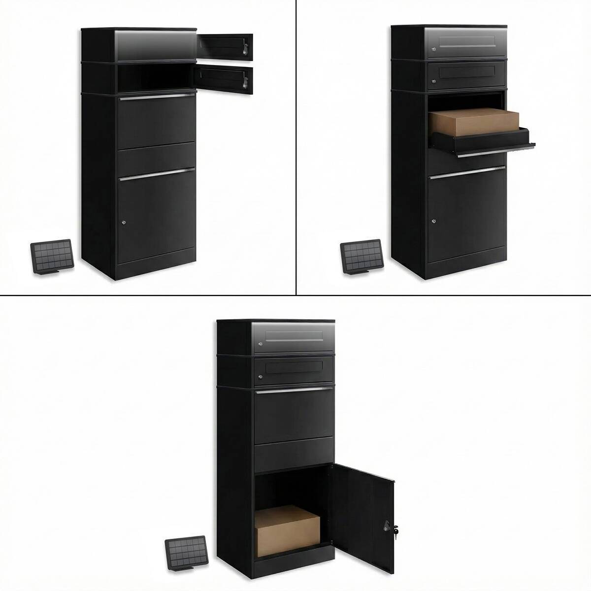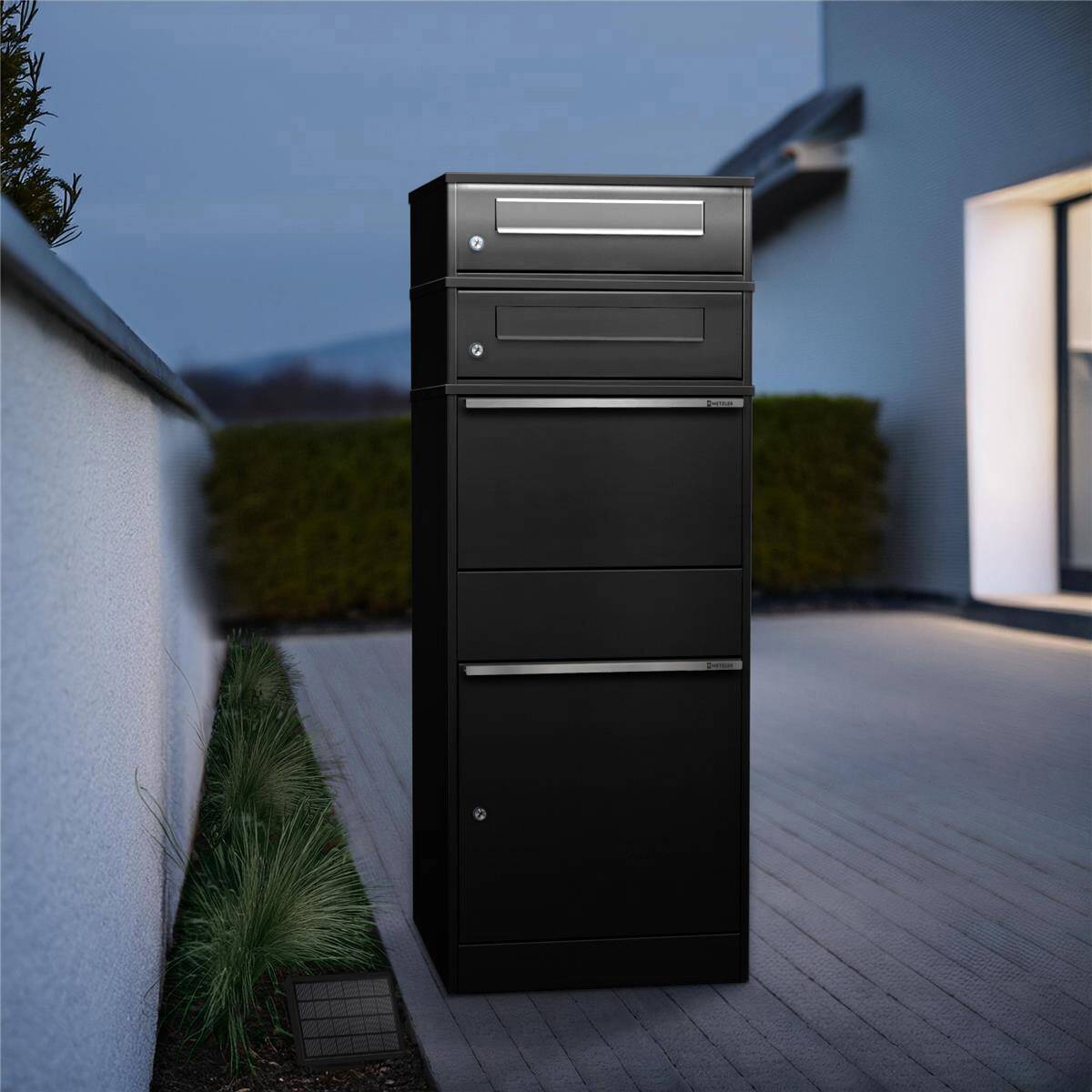 Un punto di forza particolare di questa cassetta pacchi è l'illuminazione integrata, alimentata da un pannello solare montabile in modo flessibile. Il pannello può essere installato direttamente sulla cassetta o nelle sue vicinanze, per garantire un approvvigionamento energetico ottimale. Soprattutto nelle stagioni più buie, l'illuminazione assicura che il corriere trovi rapidamente e facilmente la cassetta.