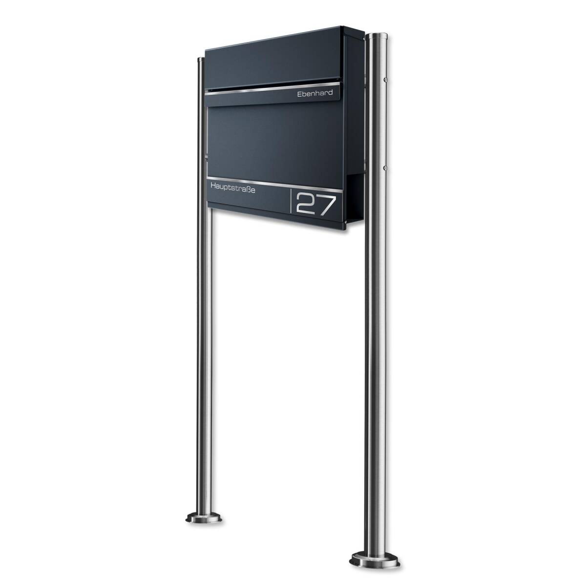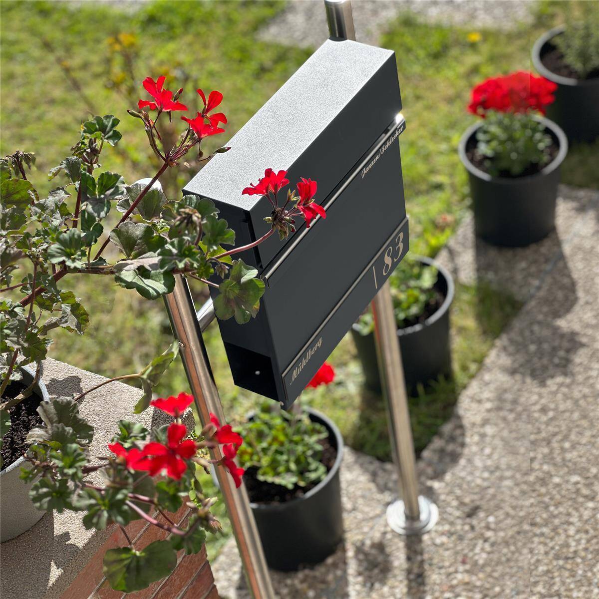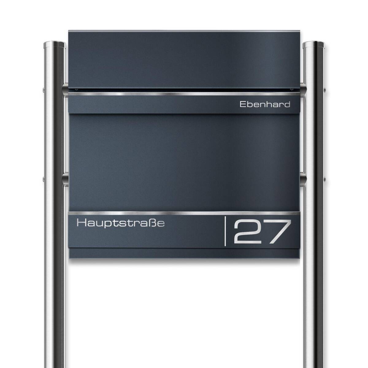 La semplice ed elegante cassetta postale autoportante si distingue per il suo corpo di alta qualità in acciaio massiccio, verniciato a polvere in antracite RAL 7016. Particolarmente eleganti risultano le strisce in acciaio inox spazzolate e color antracite. Come ulteriore punto di forza è disponibile un'incisione laser personalizzata per il vostro nome, numero civico e strada. Si può scegliere tra diversi tipi di carattere moderni. L'incisione laser in acciaio inox, che non sbiadisce, offre un bel contrasto con lo sfondo grigio antracite ed è quindi ben visibile anche da lontano.