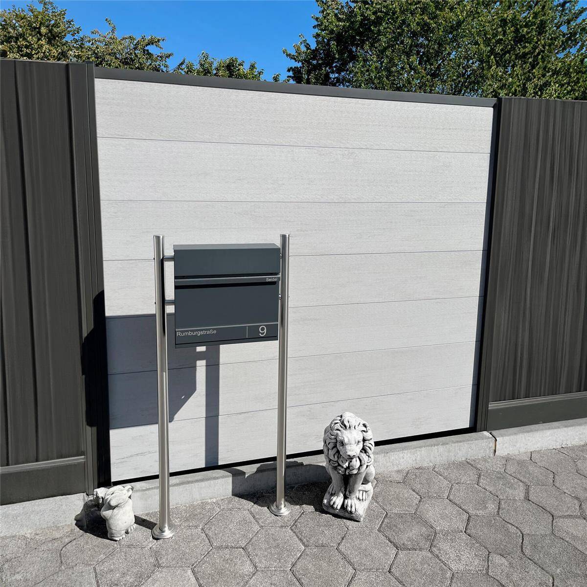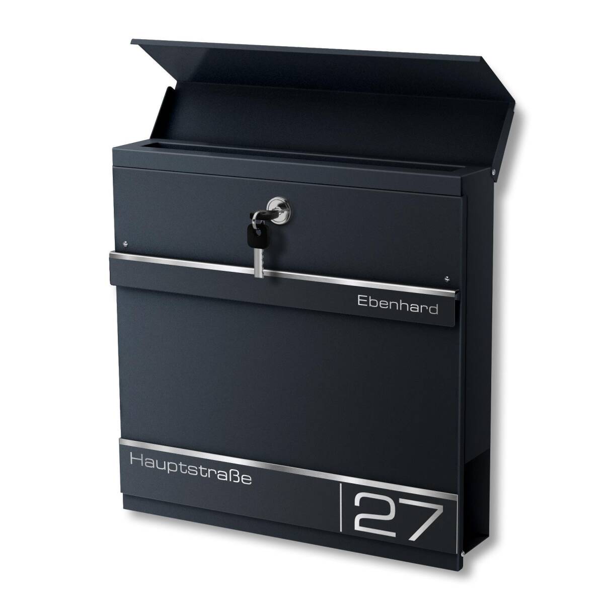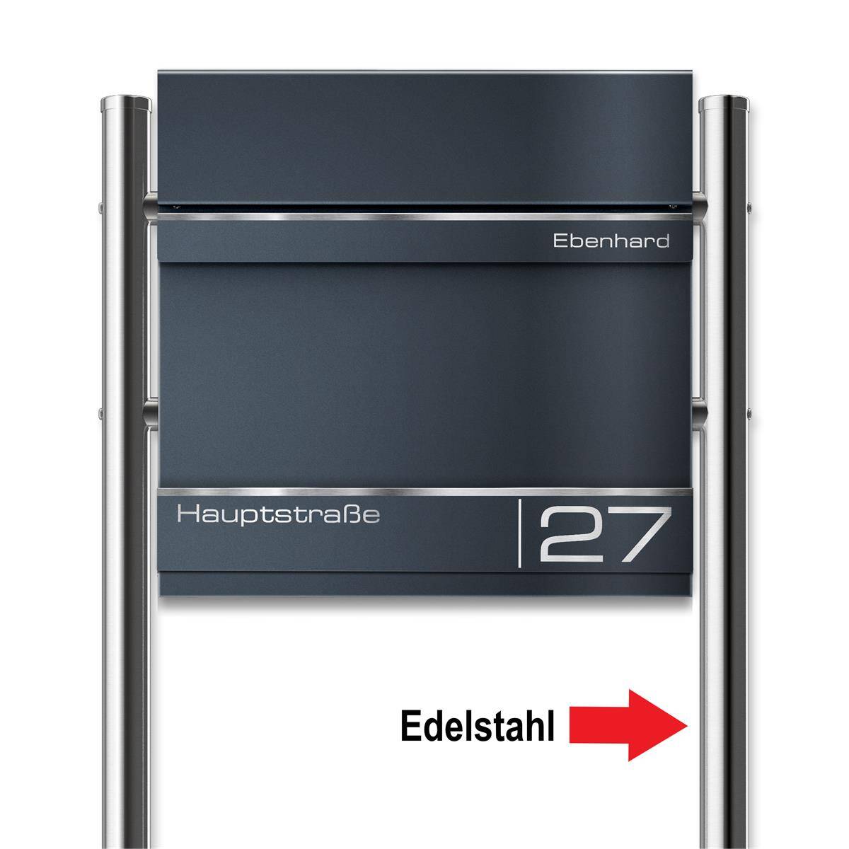 La semplice ed elegante cassetta postale autoportante si distingue per il suo corpo di alta qualità in acciaio massiccio, verniciato a polvere in antracite RAL 7016. Particolarmente eleganti risultano le strisce in acciaio inox spazzolate e color antracite. Come ulteriore punto di forza è disponibile un'incisione laser personalizzata per il vostro nome, numero civico e strada. Si può scegliere tra diversi tipi di carattere moderni. L'incisione laser in acciaio inox, che non sbiadisce, offre un bel contrasto con lo sfondo grigio antracite ed è quindi ben visibile anche da lontano.