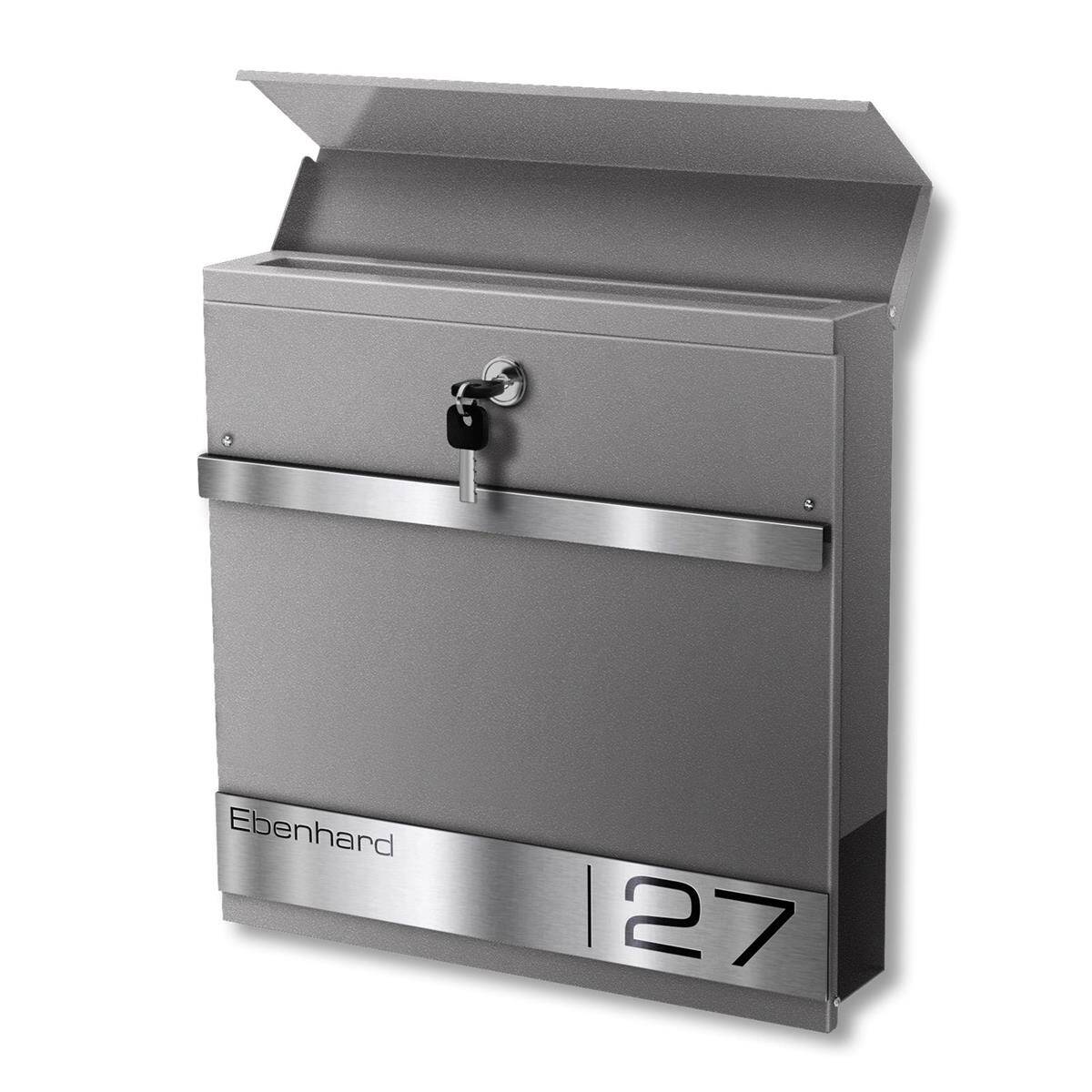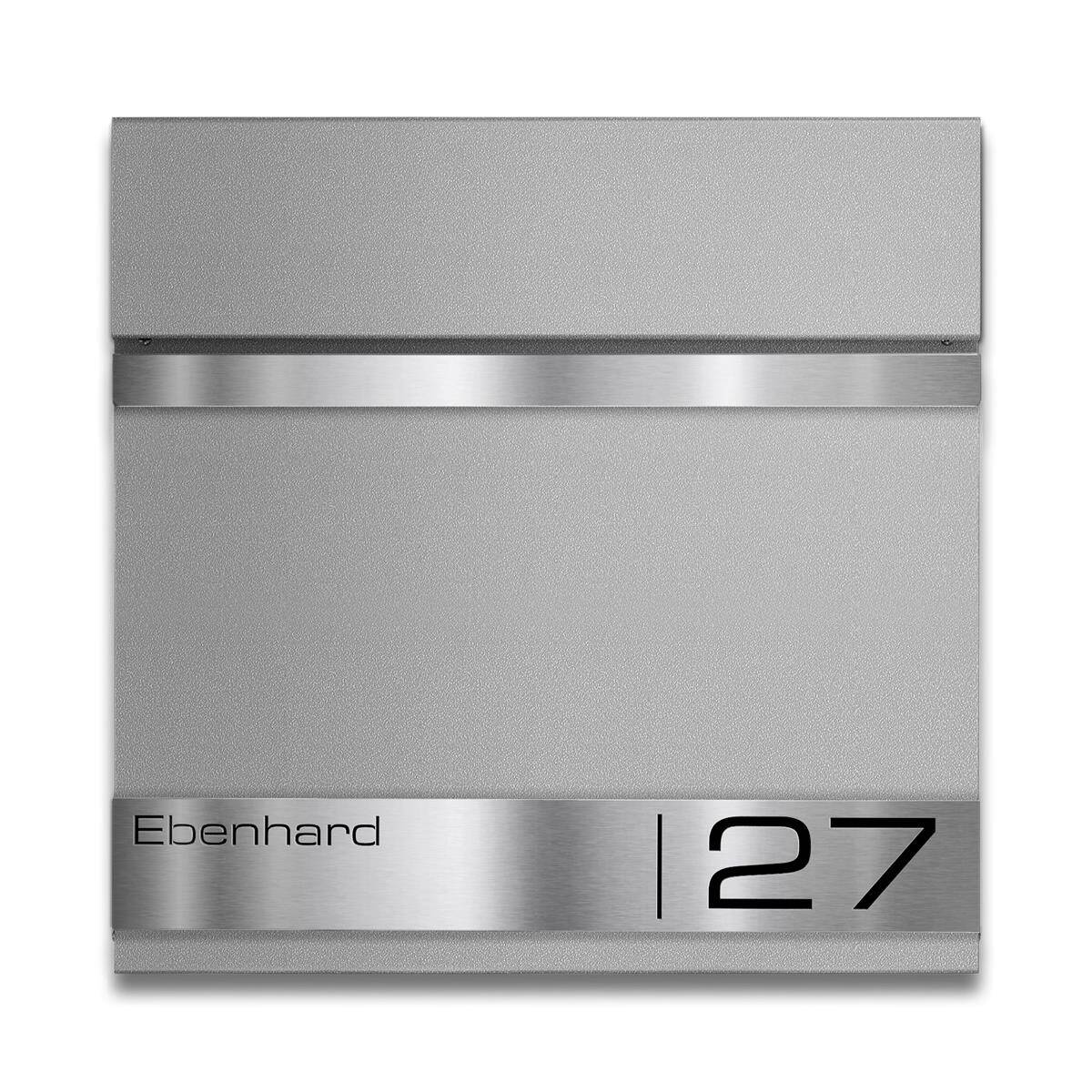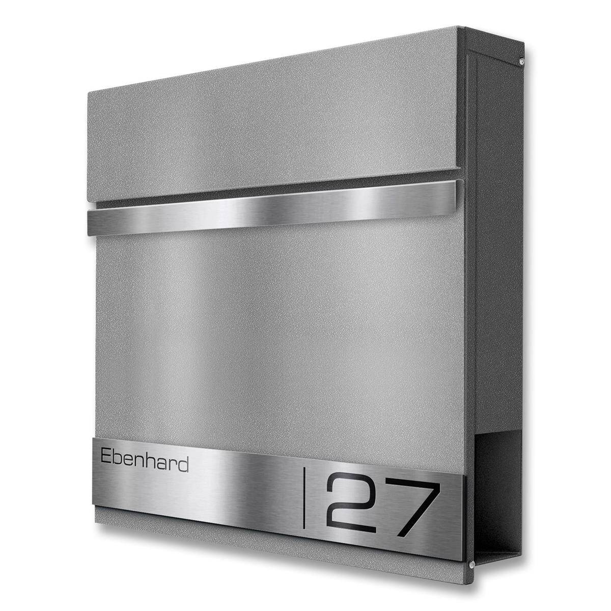 Come elemento distintivo, la cassetta postale presenta una targa in rilievo in acciaio inox V4A, che può essere incisa al laser con il vostro cognome e il numero civico. Potete scegliere tra molti font moderni per dare un tocco personale alla vostra cassetta postale.