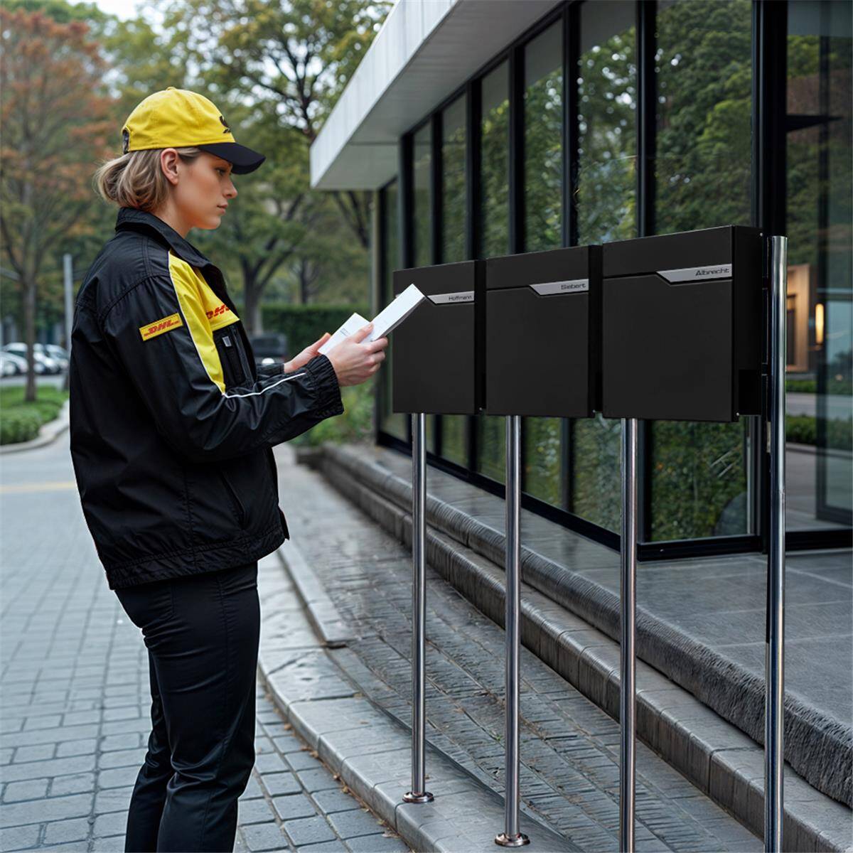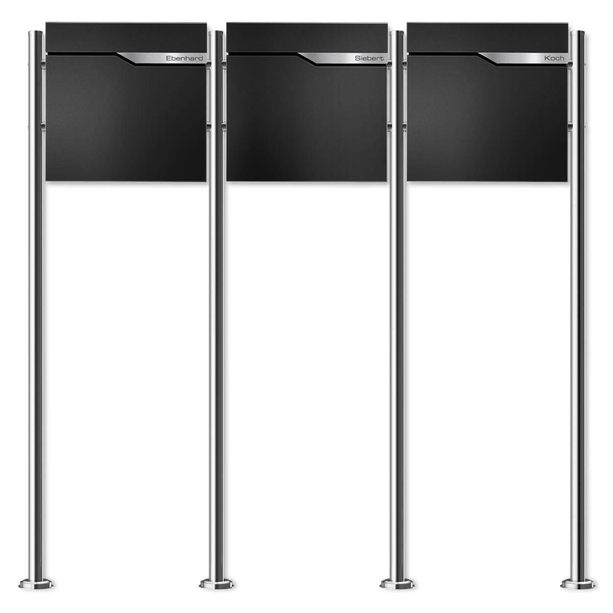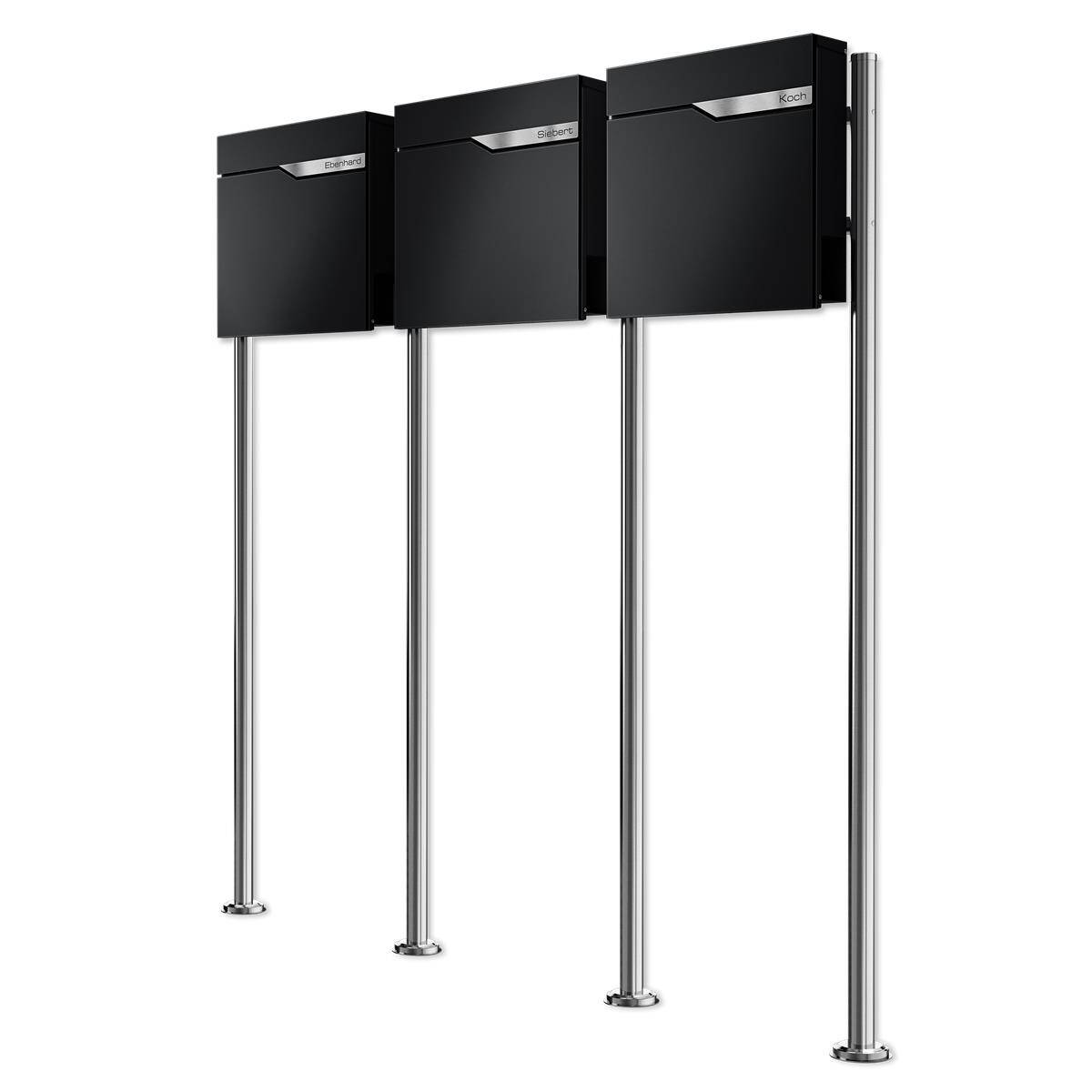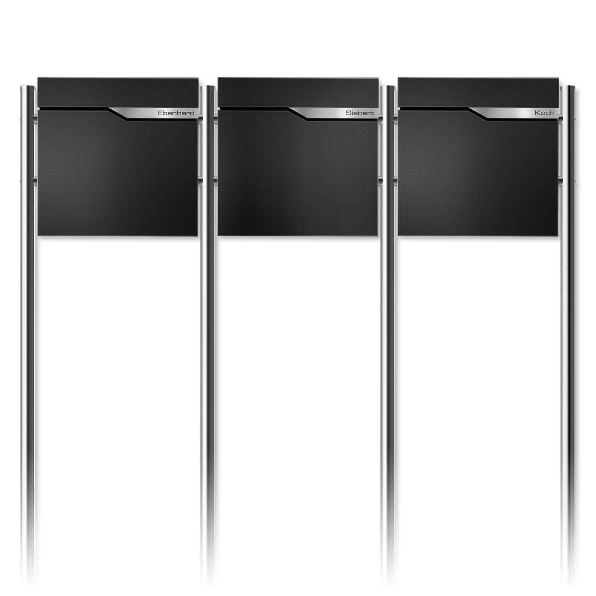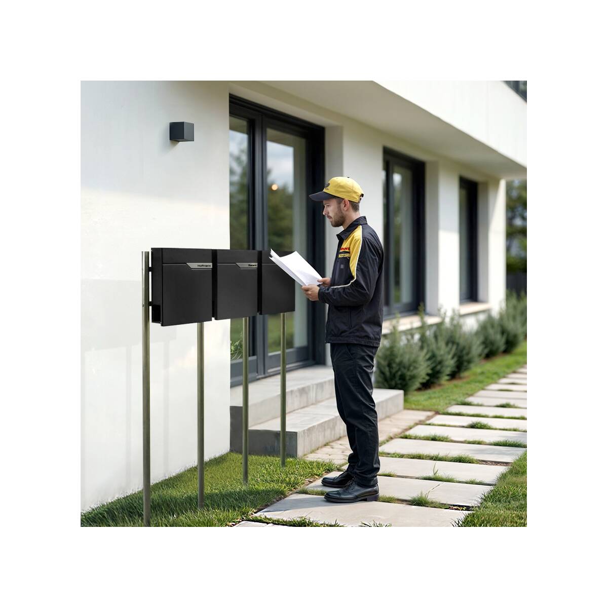 Cassetta postale indipendente Metzler per case con 3 appartamenti/parti in acciaio massiccio. Le cassette postali vengono verniciate a polvere in RAL 9005 Nero Profondo dopo la produzione per una migliore resistenza agli agenti atmosferici. Così, gli agenti atmosferici non possono danneggiare la cassetta postale. Le superfici incise in acciaio inox, antiruggine, rendono la cassetta postale esclusiva e si distinguono per la qualità unica di Metzler.