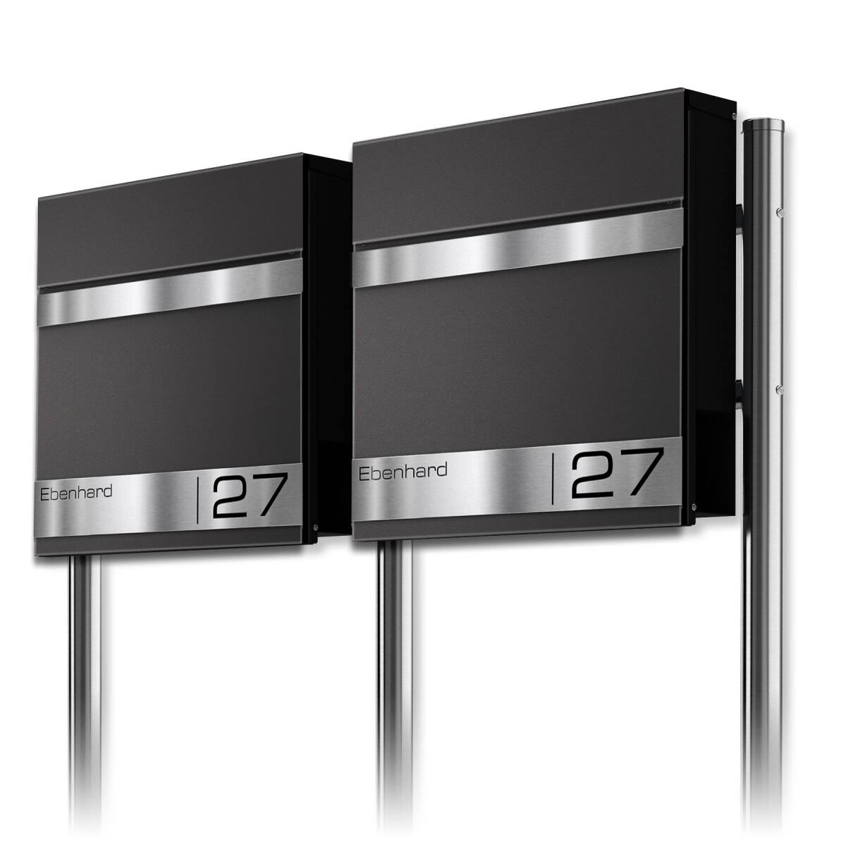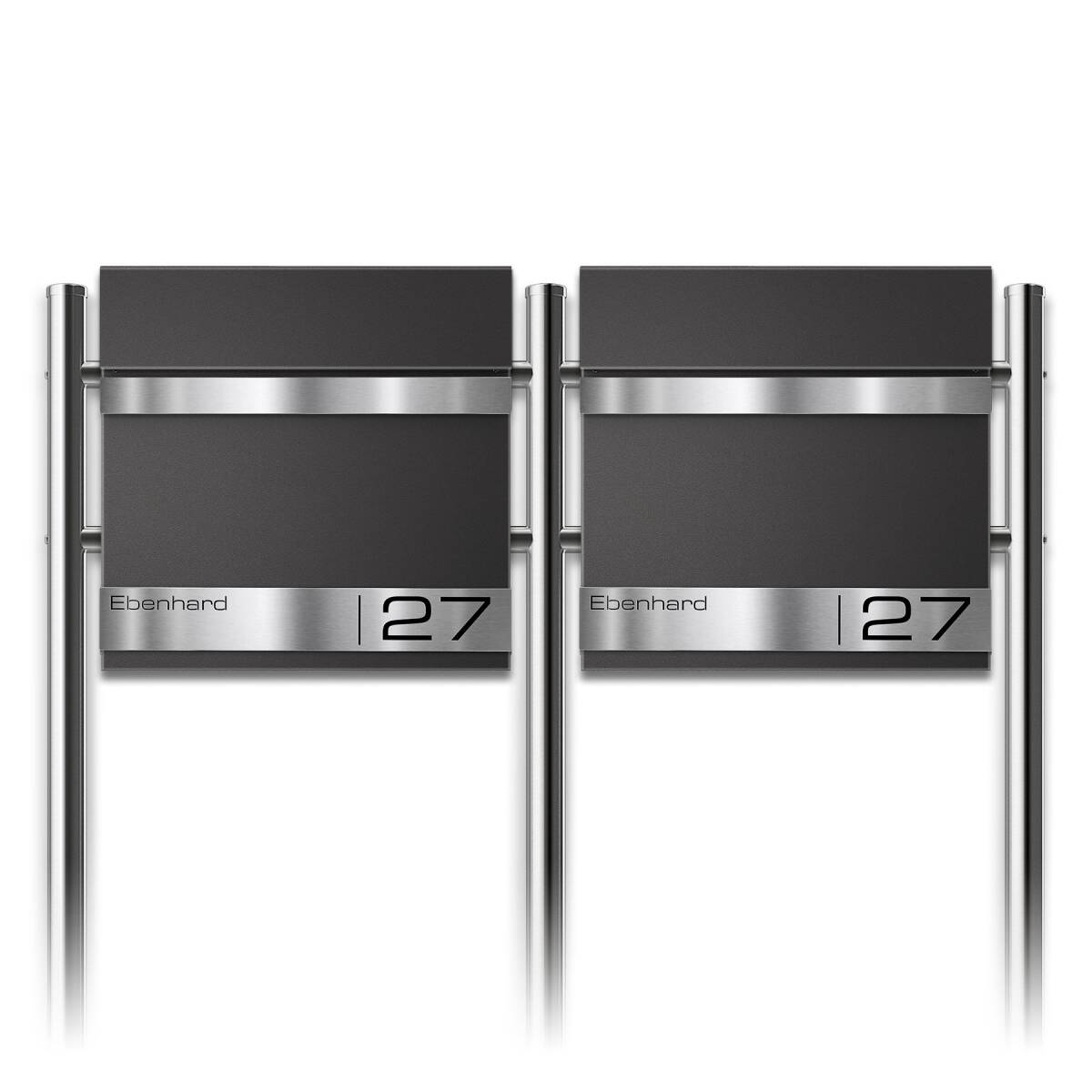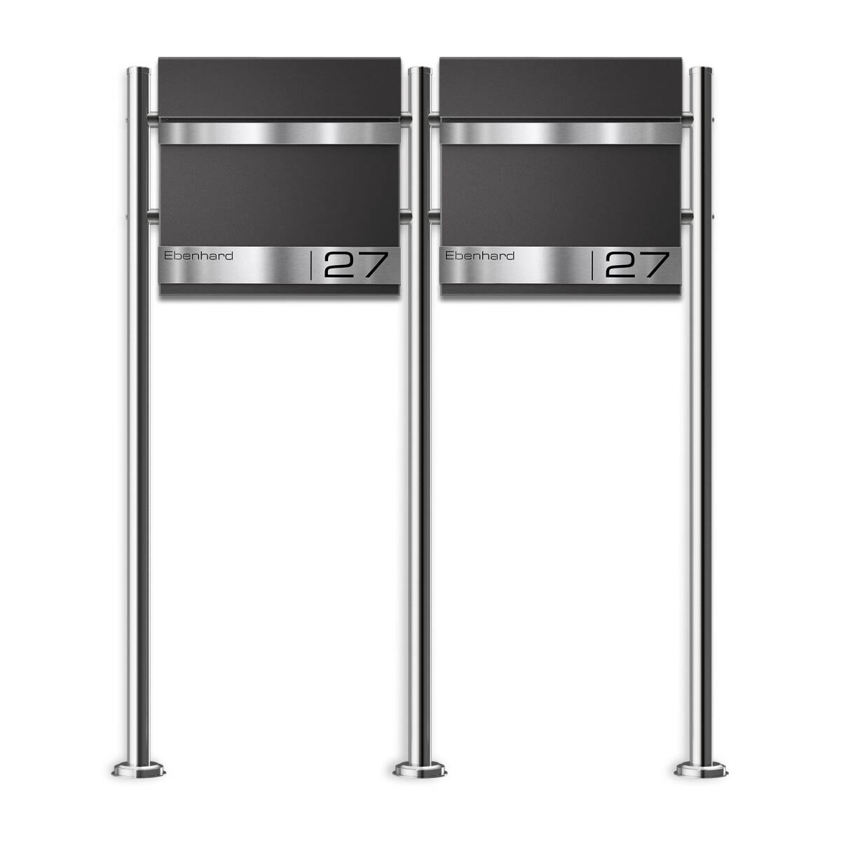 Cassetta postale autoportante Metzler per case con 2 appartamenti / unità abitative in acciaio massiccio. A seconda della versione, le cassette postali vengono verniciate a polvere in un colore RAL dopo la produzione per una migliore resistenza agli agenti atmosferici. In tal modo, vento e intemperie non danneggiano la cassetta. Le superfici incise in acciaio inossidabile si distinguono elegantemente e si fanno notare per la qualità unica Metzler.