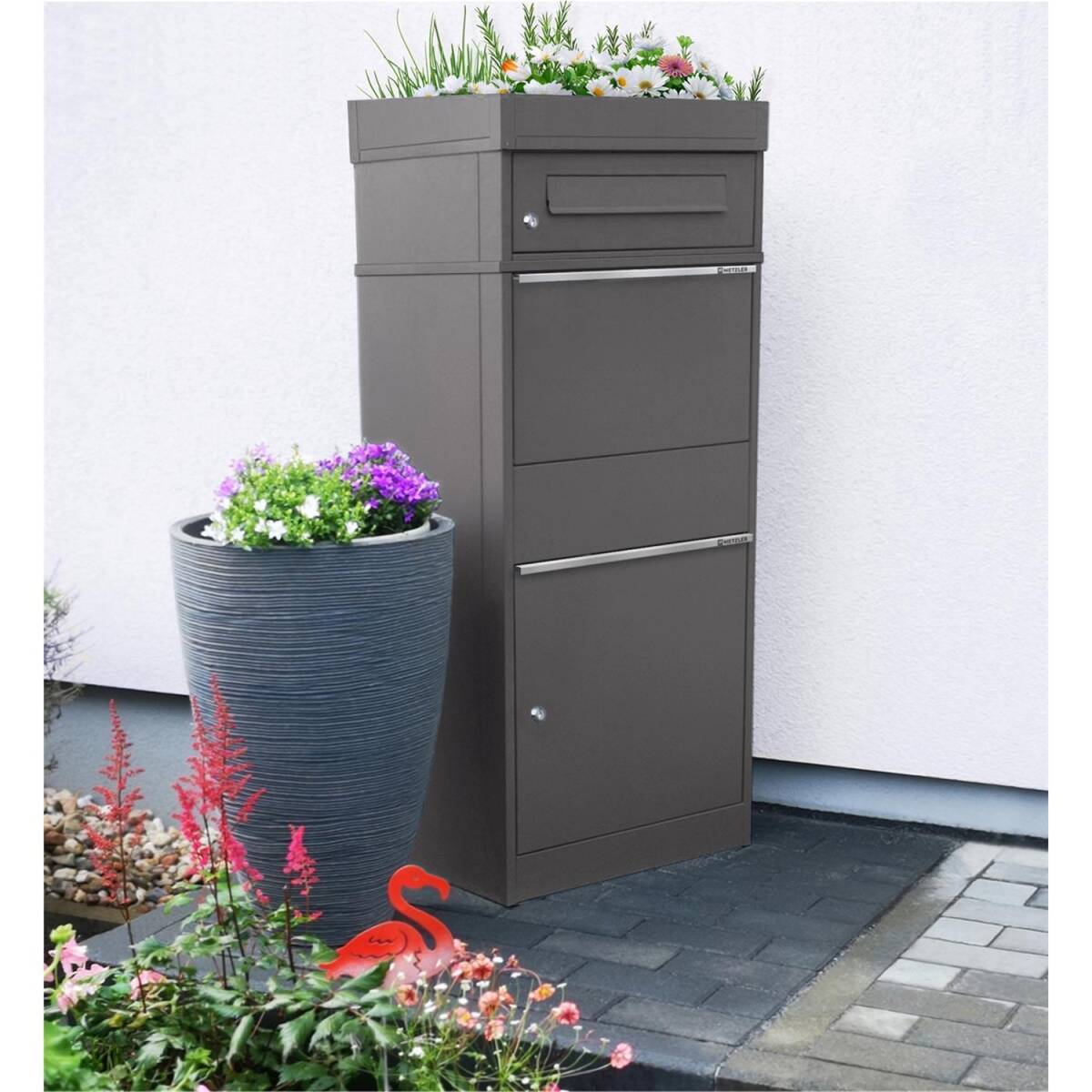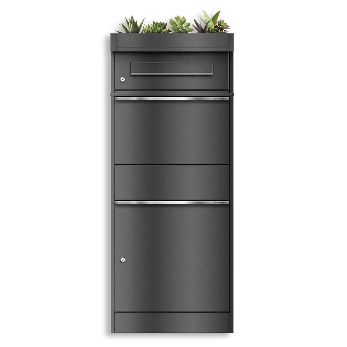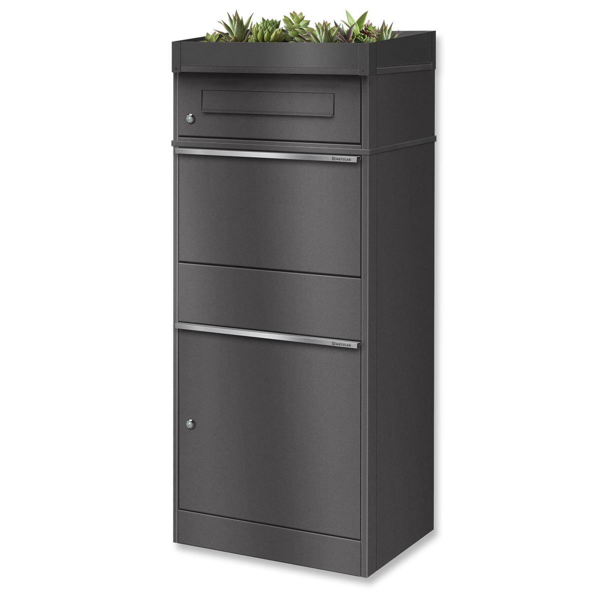 Metzler cassetta pacchi con tetto piantumato, DB 703 ferro micaceo, inox e massiccia, modello Bispo