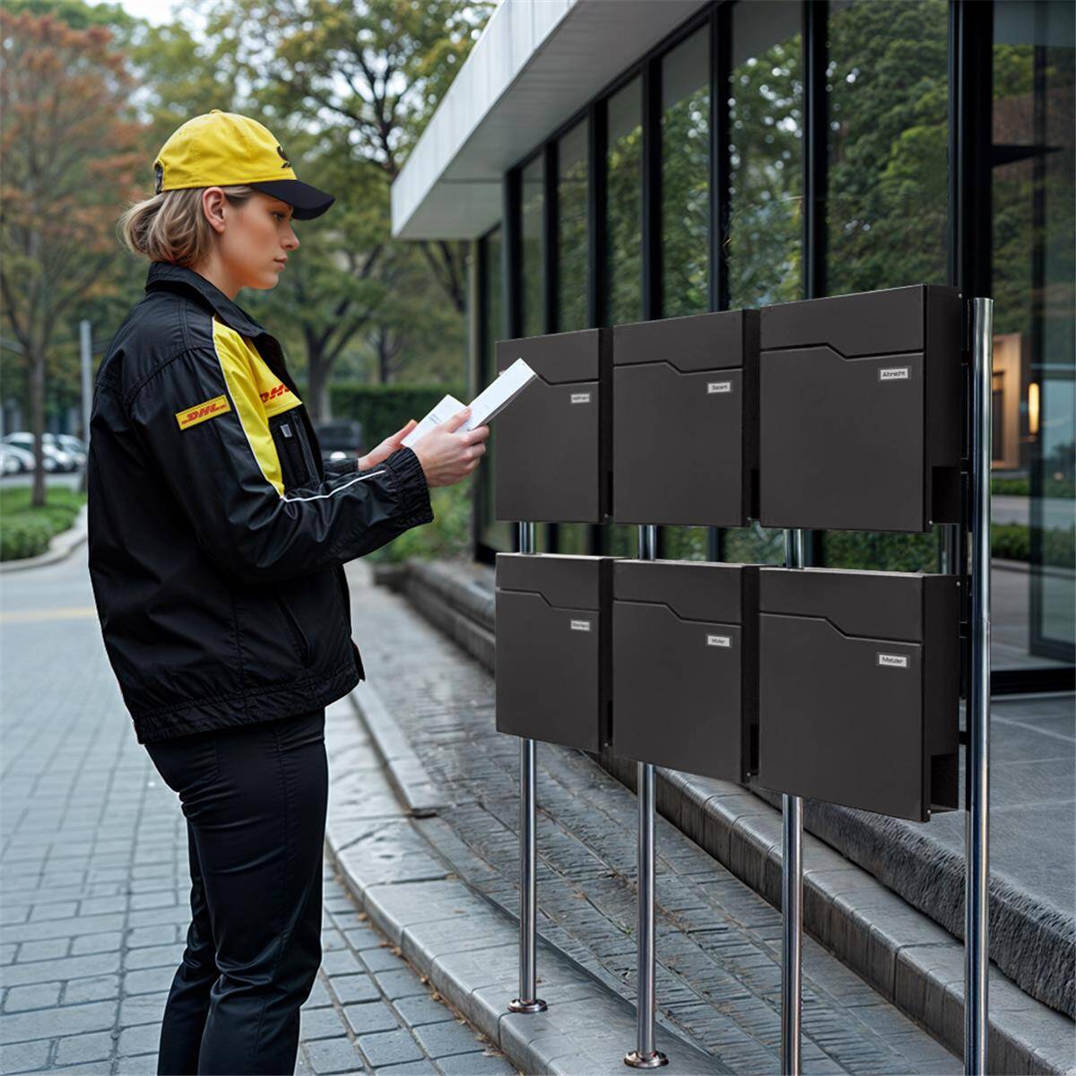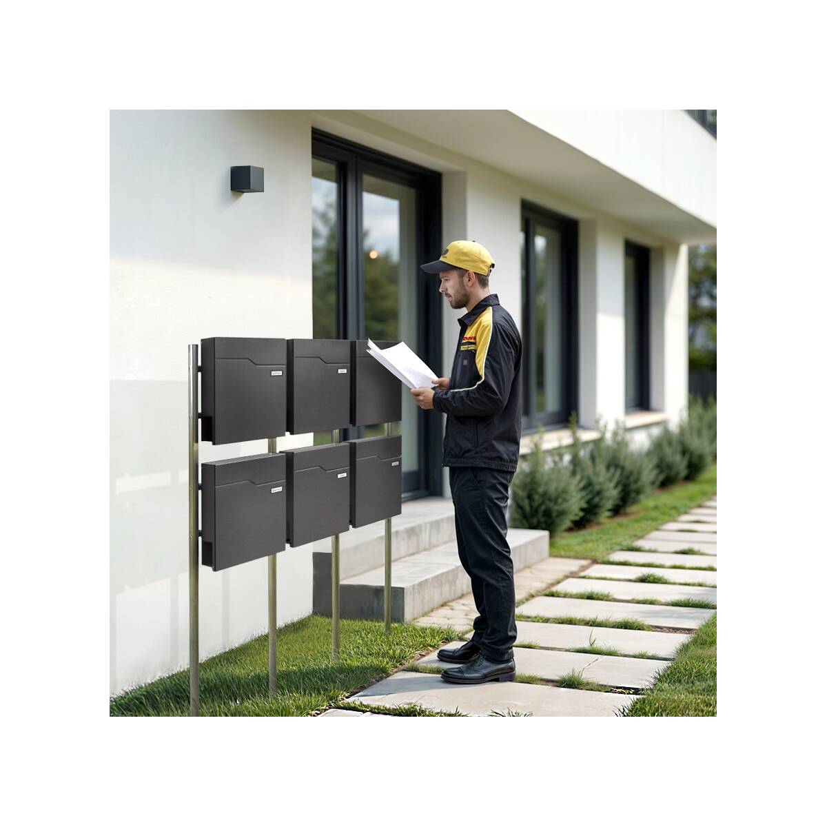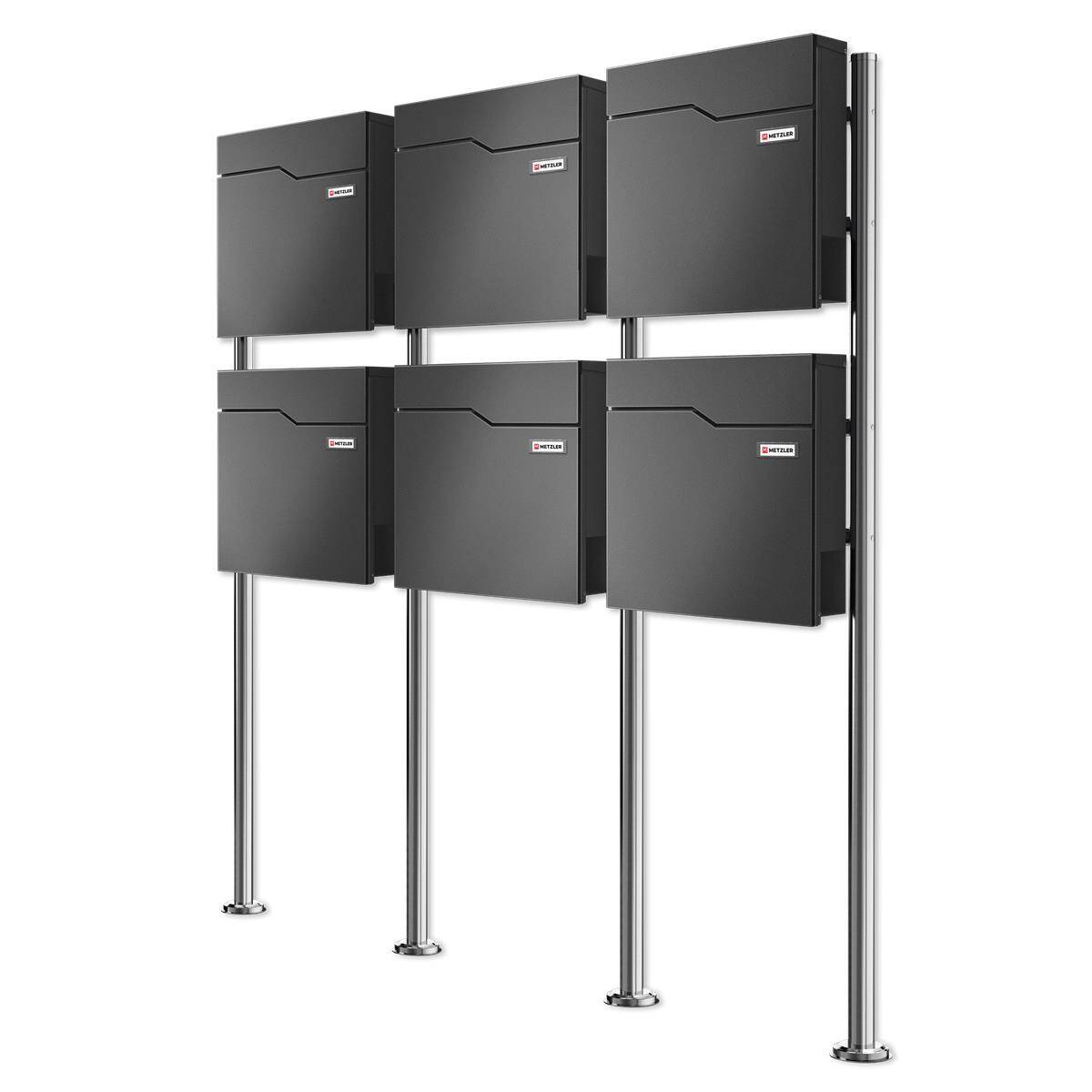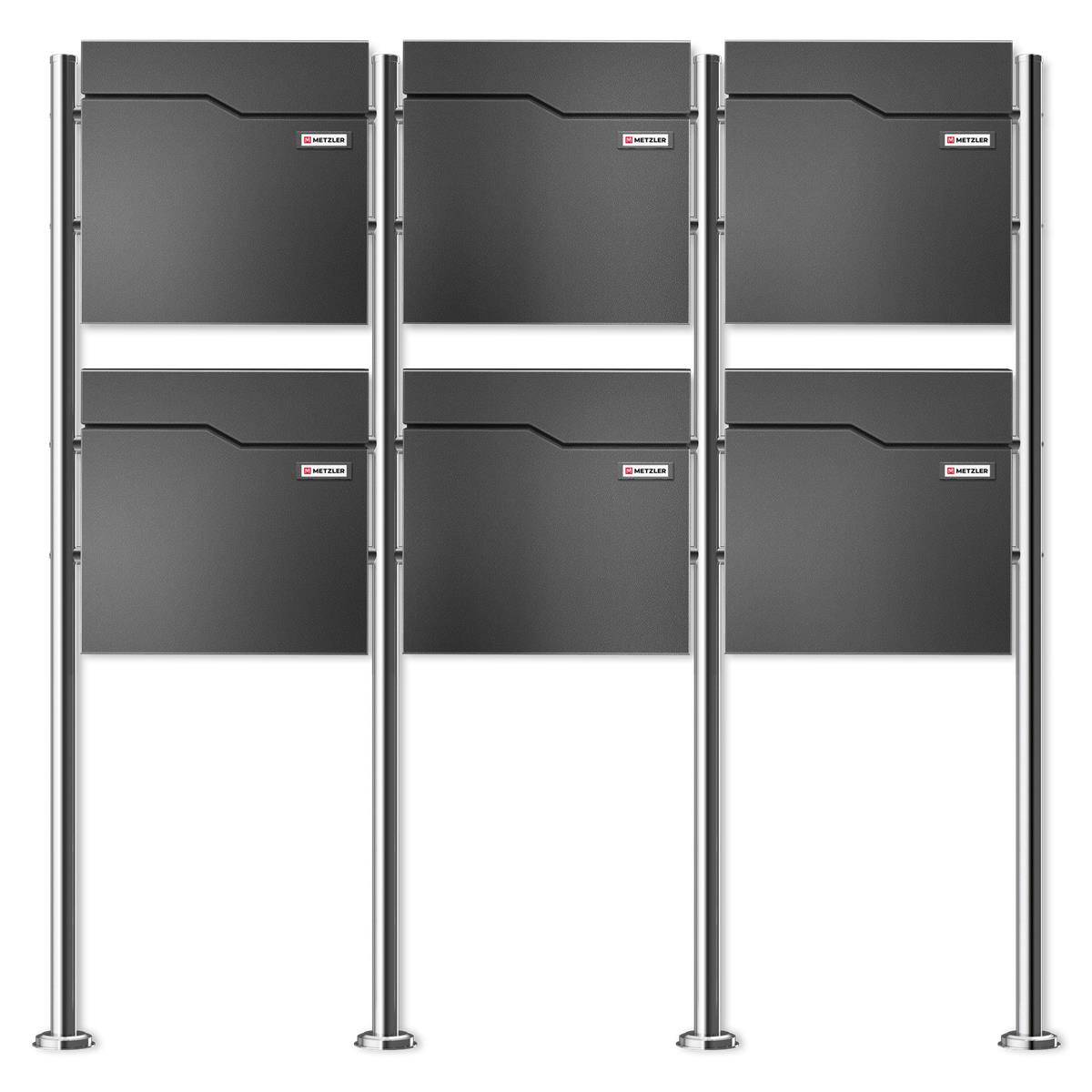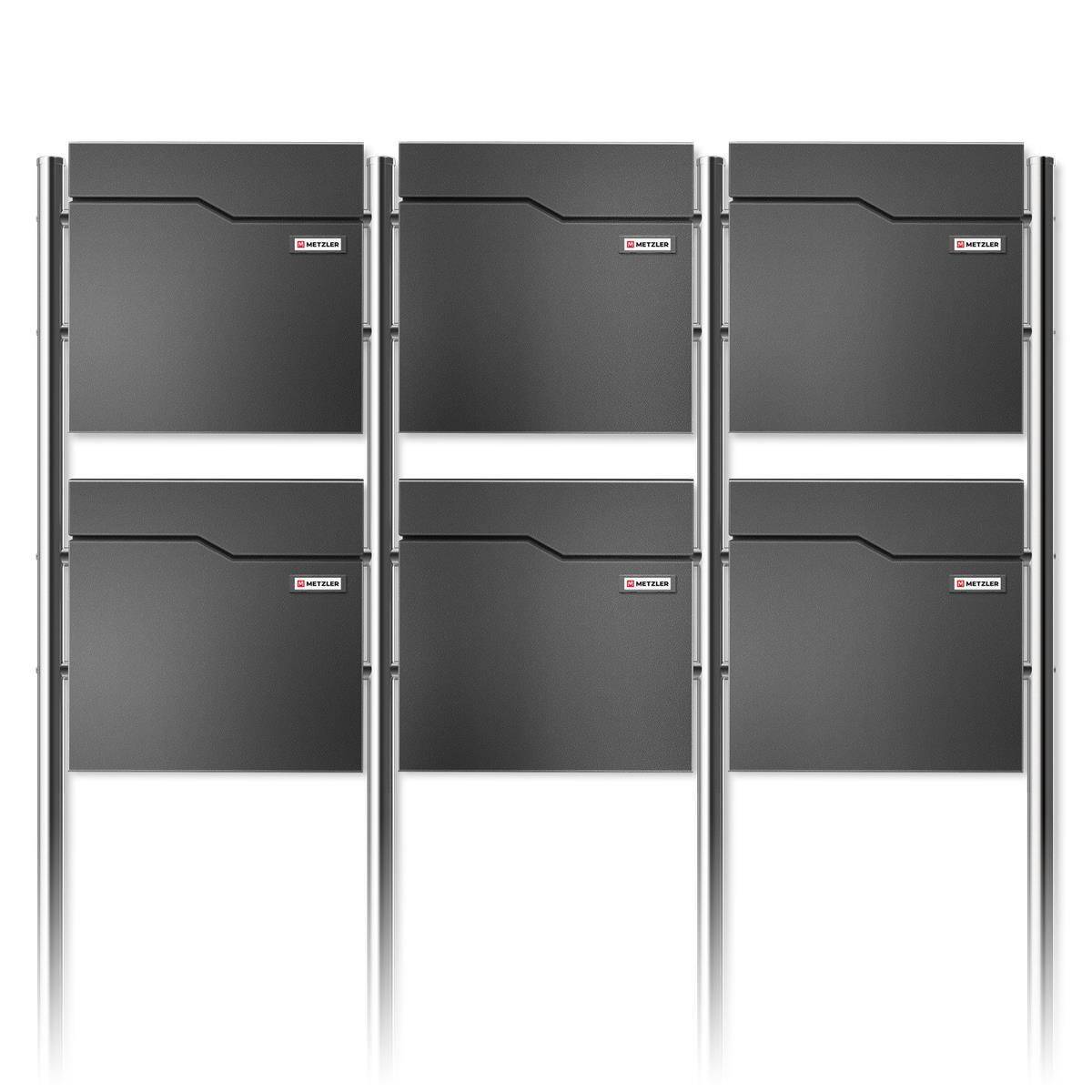 Cassetta postale indipendente Metzler per edifici con 6 appartamenti/ unità realizzata in acciaio massiccio. Le cassette postali sono successivamente rivestite con vernice a polvere Grigio Ferro Micaceo DB 703 per migliorarne la resistenza agli agenti atmosferici. In questo modo, la cassetta postale è protetta dagli effetti del vento e delle intemperie.