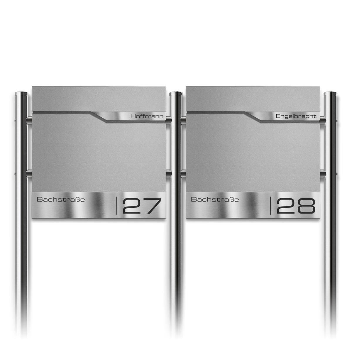Cassetta postale freestanding Metzler per case con 2 appartamenti / unità abitative in acciaio massiccio. A seconda della versione, le cassette postali vengono verniciate a polvere in un colore RAL dopo la produzione per una migliore resistenza agli agenti atmosferici. In questo modo, il vento e il maltempo non possono intaccare la cassetta postale. Le superfici incise in acciaio inox antiruggine differenziano la cassetta postale delle altre e impressionano grazie alla qualità unica di Metzler.