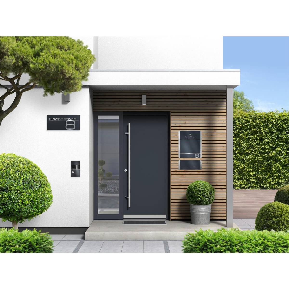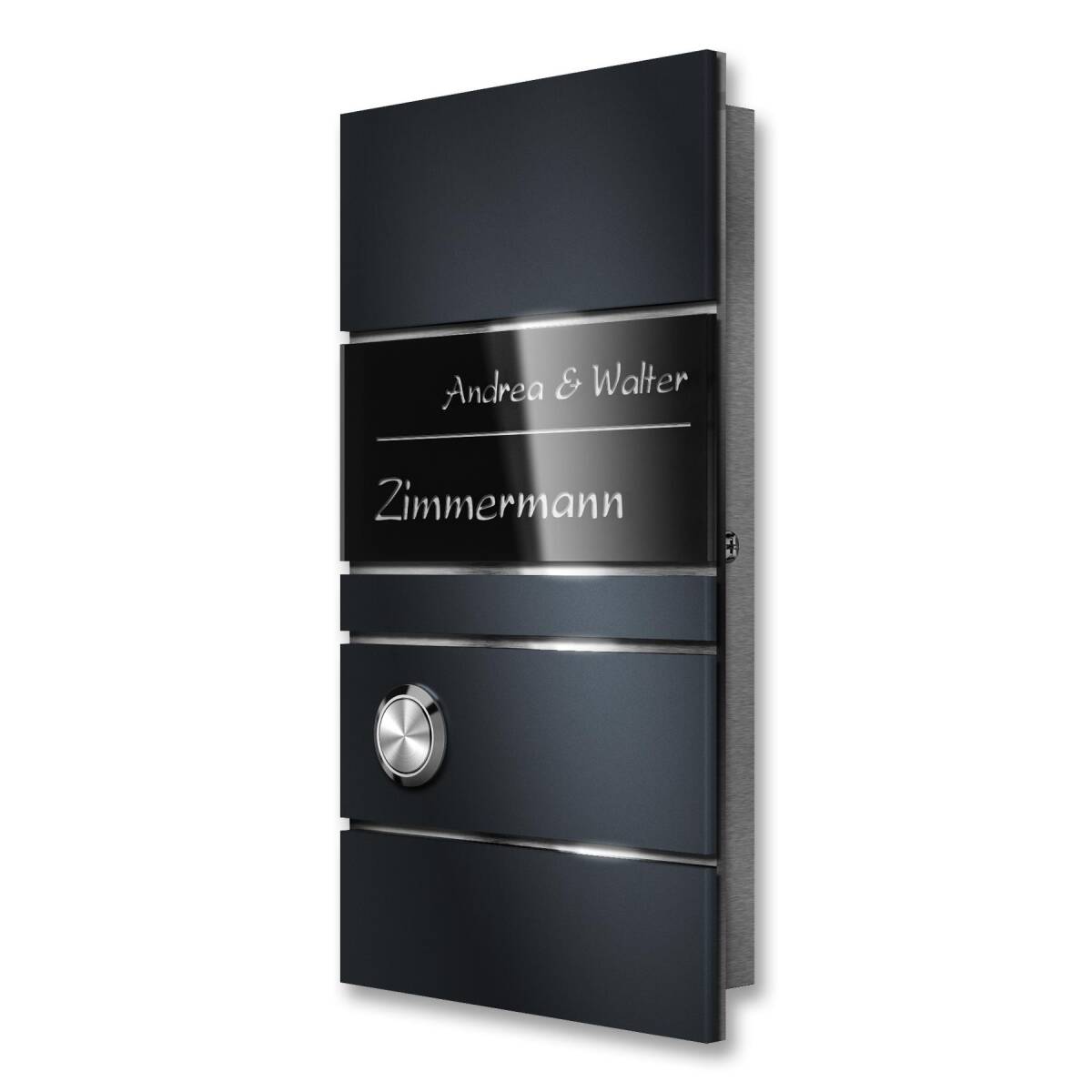Die Klingel enthält außerdem einen leistungsstarken Funksender, dessen Reichweite 200 Meter im freien Feld beträgt und mithilfe unseres Signalverstärkers auf 800 Meter erweiterbar ist.* Als Standard empfehlen wir einen kabellosen Anschluss: Der in der Klingelplatte integrierte Sender wird über eine Batterie betrieben (Lebensdauer 12-15 Monate) – für eine einfache und kabellose Installation. Den batteriebetriebenen Gong können Sie auch mit auf den Balkon oder in den Garten nehmen. So können Sie sicher sein, keinen Besuch mehr zu verpassen. Der eingebaute LED-Drucktaster ist ebenso pflegeleicht und witterungsbeständig wie das Klingelschild, denn er ist aus Edelstahl und wasserdicht nach IP67. Für die Ringbeleuchtung des Drucktasters stehen Ihnen unterschiedliche Farben (Weiß, Blau, Rot, Grün, Gelb oder ohne LED) zur Verfügung.