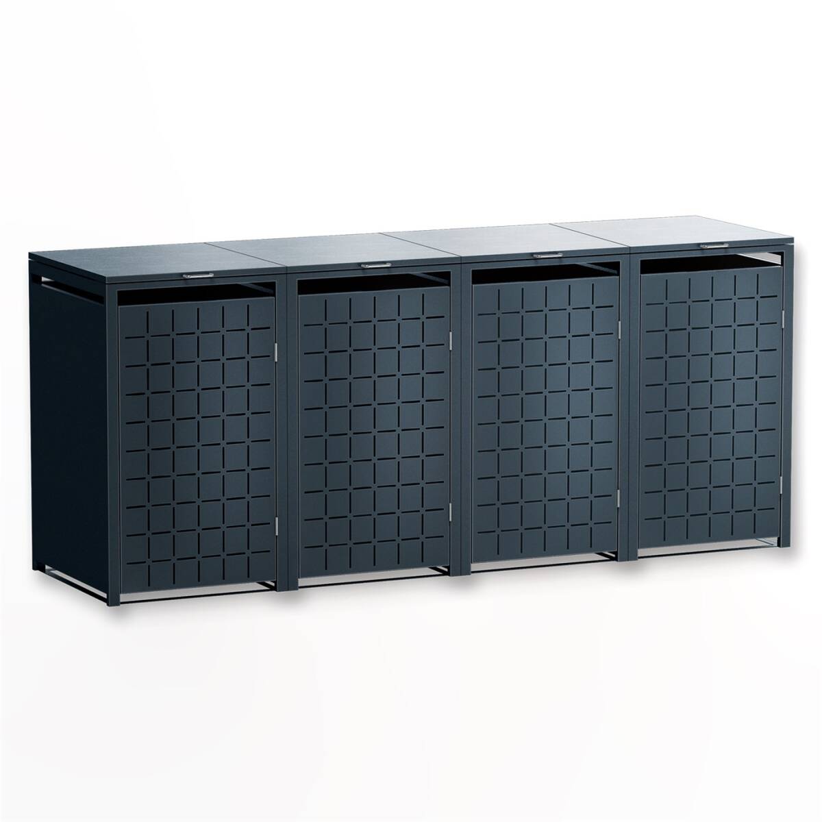 Die Mülltonnenbox der Modellreihe "Geo" bietet Platz für vier 240-Liter-Mülltonnen und eignet sich für große Haushalte, Mehrfamilienhäuser oder Gewerbeobjekte. Das gelaserte Quadratraster sorgt auf der breiten Front für eine einheitliches Gesamtbild.
