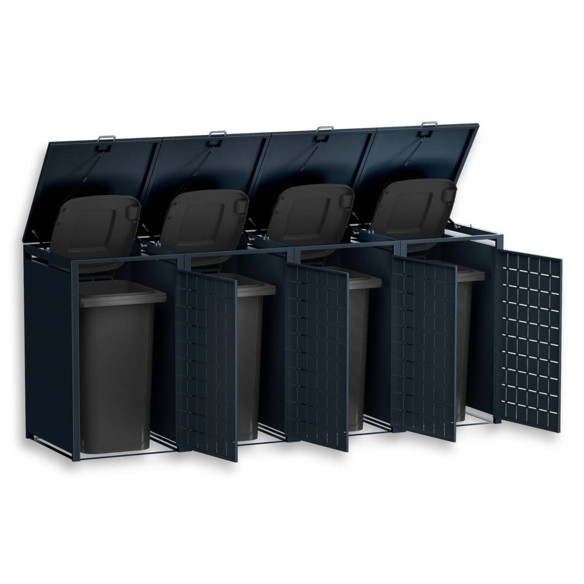 Für die Mülltonnenboxen verwenden wir verzinkten Stahl. Die zusätzliche Pulverbeschichtung in Anthrazitgrau RAL 7016 schützt dauerhaft vor UV-Strahlen, Regen und Schnee und sorgt für eine moderne Optik mit angenehmer Haptik.