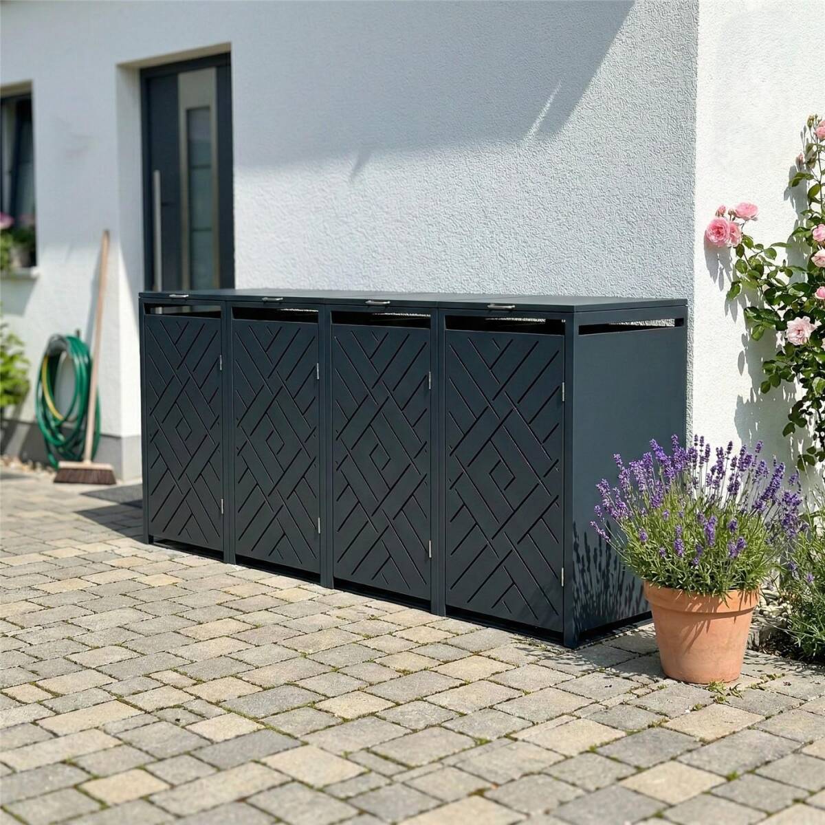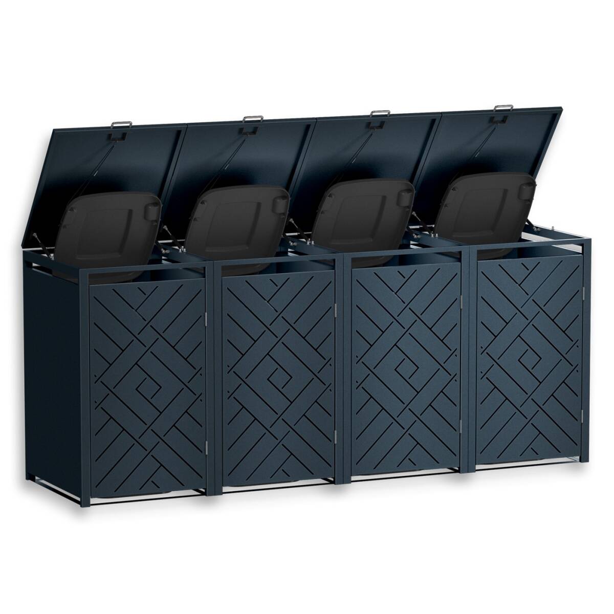 Die Mülltonnenbox der Modellreihe „Prisma" bietet Platz für vier 240-Liter-Mülltonnen. Über die gesamte Viererfront verschränken sich diagonale Linien zu einem Geflecht aus Rauten und zentralen Quadraten – vier Mülltonnen verschwinden hinter einer durchgestalteten Front.