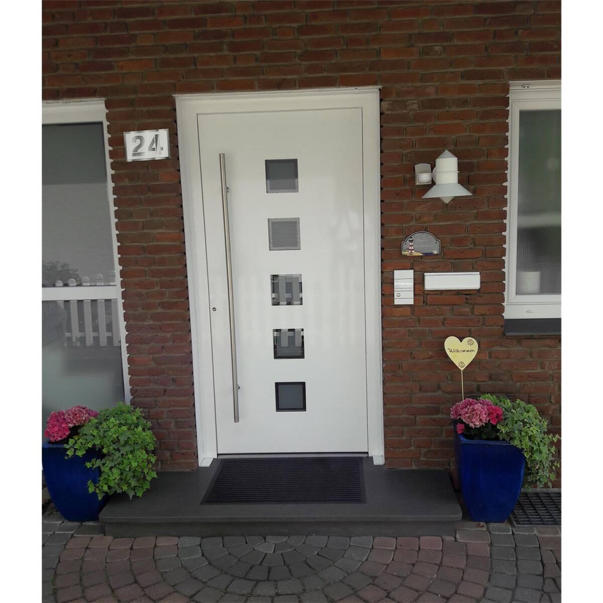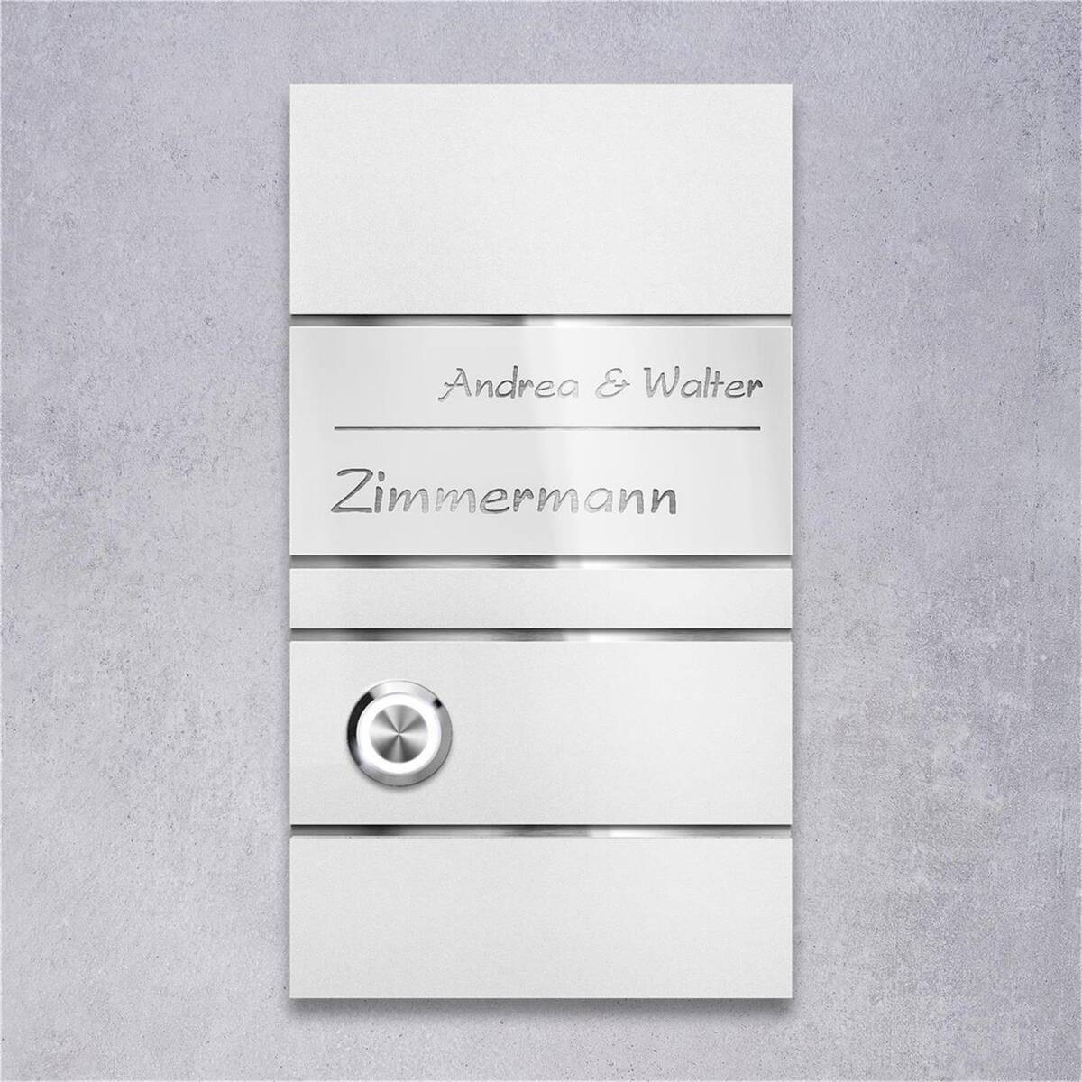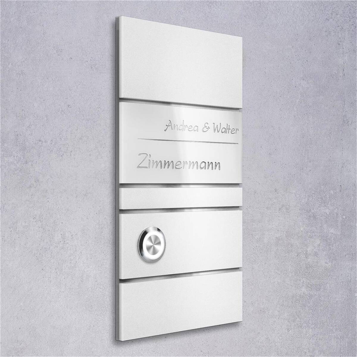 Das Klingelschild besticht durch die hochwertige Kombination der Grundplatte aus rostfreiem Edelstahl und der Front aus Acrylglas in Weiß matt, sowie dem hochglänzenden Namensschild in Weiß. Dadurch sieht die Klingel nicht nur schön aus, sondern ist auch absolut witterungsbeständig und sieht auch nach Jahren noch aus wie am ersten Tag.