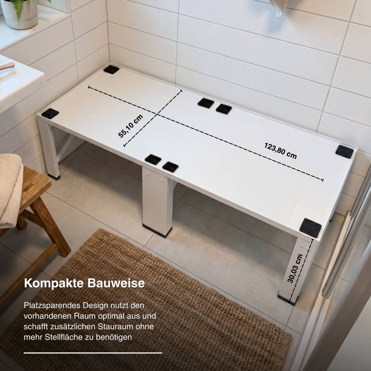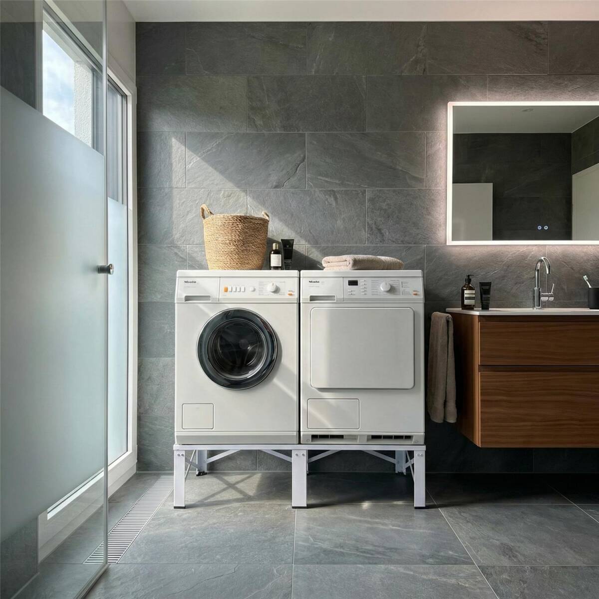 Die robuste Stahlkonstruktion mit zusätzlicher Verstrebung sorgt für einen sicheren Stand – auch bei hohen Schleuderdrehzahlen. Beide Geräte bleiben zuverlässig positioniert, ohne zu verrutschen oder zu vibrieren. Die pulverbeschichtete Oberfläche in Weiß ist pflegeleicht und fügt sich dezent in jeden Waschraum oder Hauswirtschaftsraum ein.