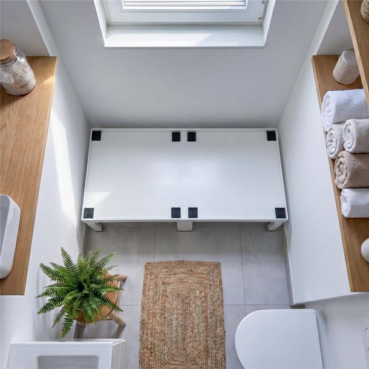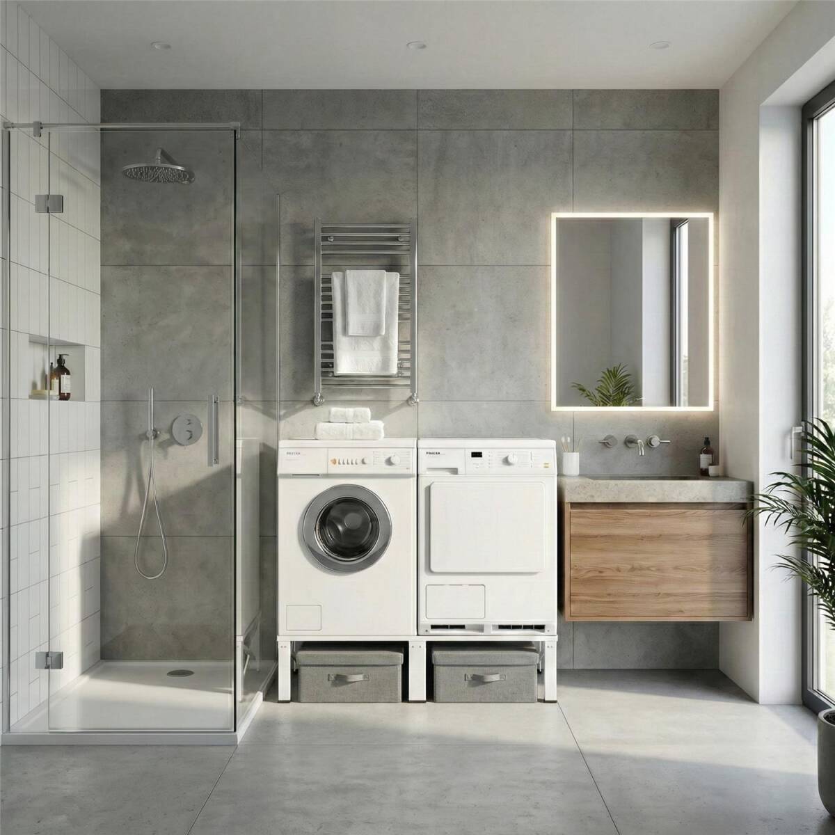 Der Freiraum unterhalb der Geräte ist kein verschenkter Platz, sondern ein echter Vorteil: Die Bodenreinigung wird deutlich einfacher, bei einem Wasseraustritt bleibt der Bereich sofort zugänglich – und gleichzeitig entsteht zusätzlicher Stauraum für Wäschekörbe, Waschmittel oder Reinigungszubehör.