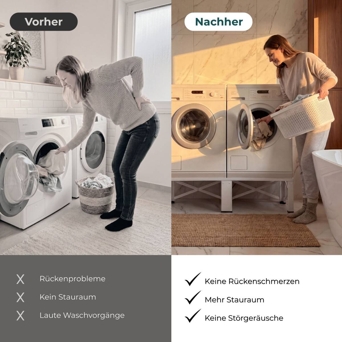 Der doppelte Waschmaschinenständer von Metzler bringt Waschmaschine und Trockner auf eine ergonomische Arbeitshöhe. Beide Geräte stehen sicher nebeneinander – das Be- und Entladen wird rückenschonender und spürbar angenehmer im Alltag. Schluss mit täglichem Bücken vor der Waschmaschine.