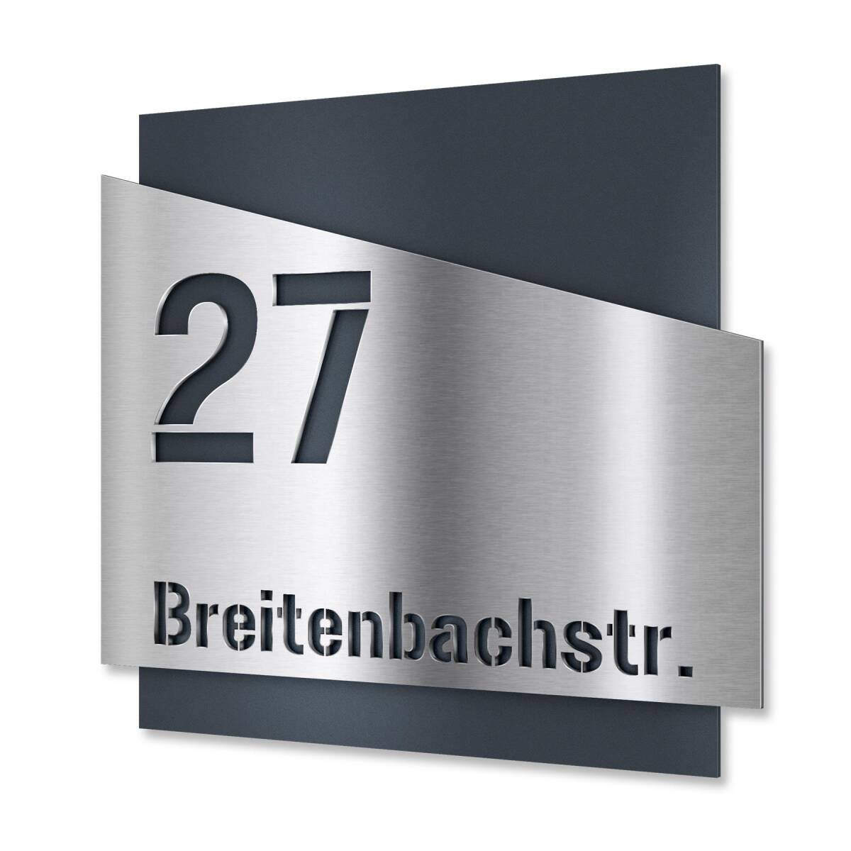 Die Grundplatte besteht aus hochwertigem Stahl, der zusätzlich in der Trendfarbe Anthrazit RAL 7016 pulverbeschichtet wird. Aus der Frontplatte, hergestellt aus rostfreiem V2A Edelstahl, wird Ihre Adresse hochpräzise ausgeschnitten. Durch die Kombination der zwei Platten entsteht ein schöner 3D-Effekt.