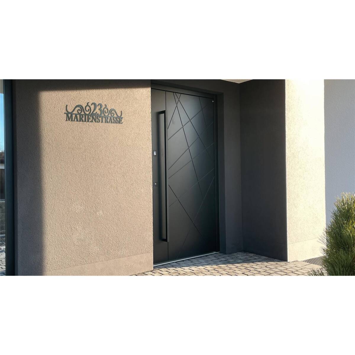 Hochwertiger, rostfreier Schriftzug aus Edelstahl extrem präzise lasergeschnitten. Der Schriftzug mit Straßenname und Hausnummer ist ein echter Blickfang und verschönert jede Fassade.