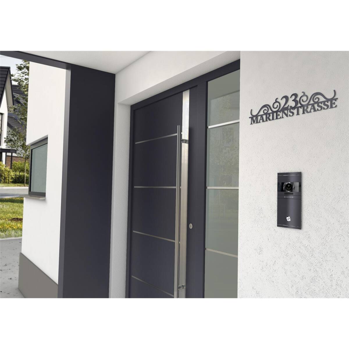 Hochwertiger, rostfreier Schriftzug aus Edelstahl extrem präzise lasergeschnitten. Der Schriftzug mit Straßenname und Hausnummer ist ein echter Blickfang und verschönert jede Fassade.