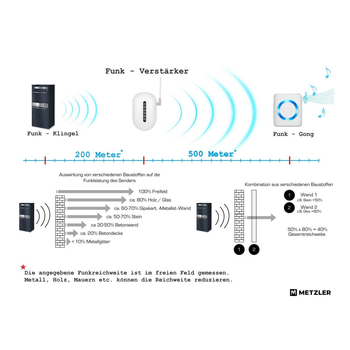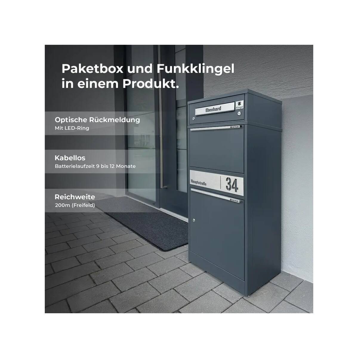 Der Metzler Briefkasten und die Paketbox mit Klingel sind die perfekte Lösung für Ihre Brief- und Paketsendungen. Sie können Ihre Zustellungen kontaktlos und rund um die Uhr empfangen. Die Paketbox ist mit einer integrierten Funkklingel ausgestattet, deren Funksender eine Reichweite von bis zu 150 Metern hat.