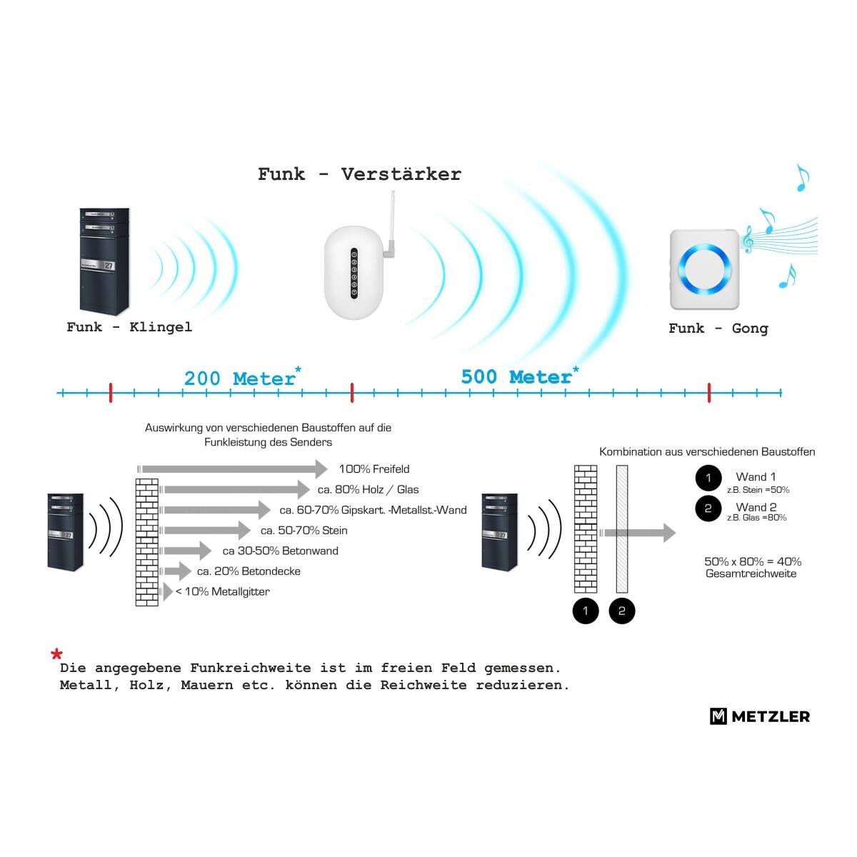 Der Metzler Briefkasten und Paketbox mit Klingel sind die perfekte Lösung für Ihre Brief- und Paketsendungen. Sie können Ihre Zustellungen kontaktlos und rund um die Uhr empfangen. Die Paketbox ist mit einer integrierten Funkklingel ausgestattet, deren Funksender eine Reichweite von bis zu 150 Metern hat.