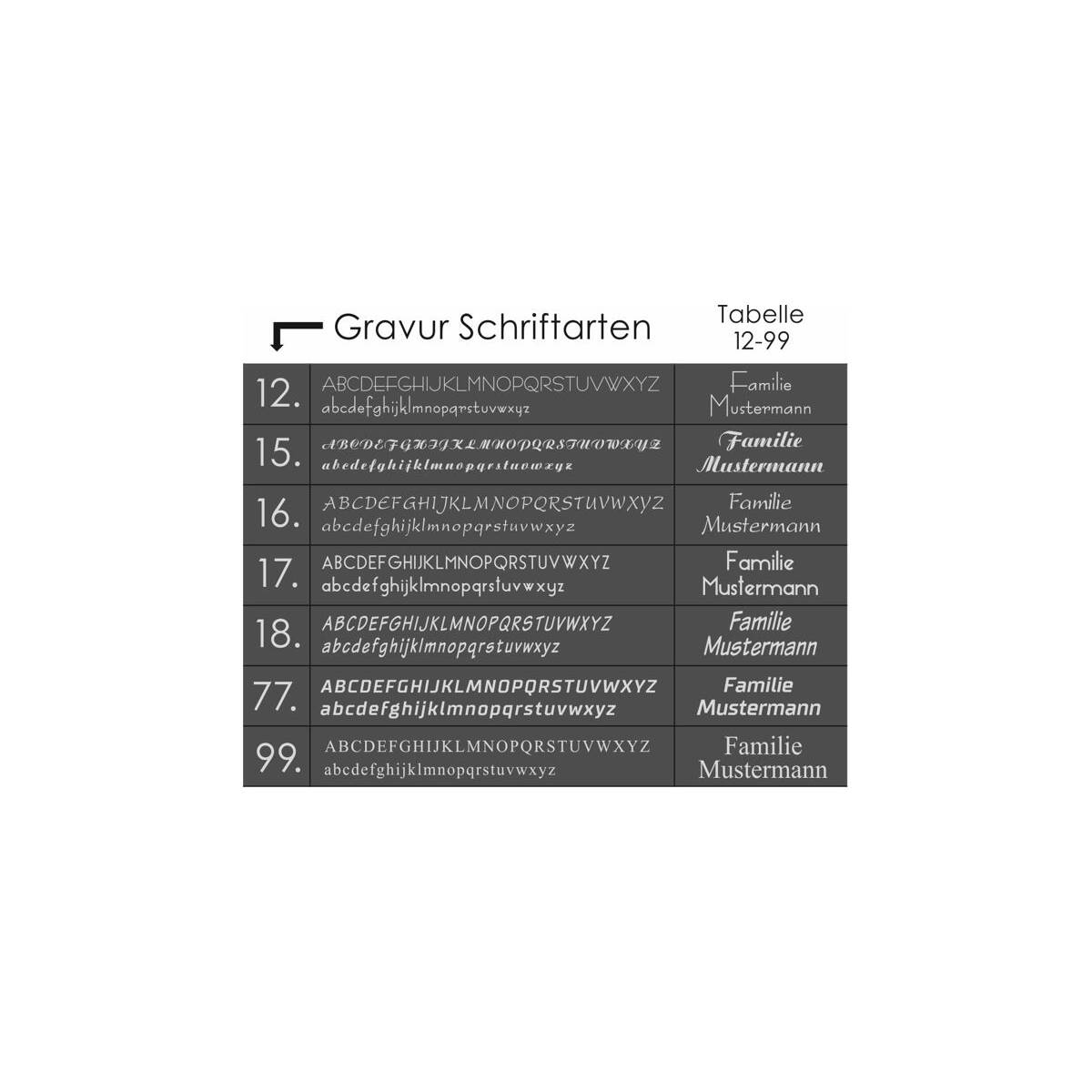 Die individuelle Lasergravur auf der Klingel besticht durch Klarheit und gute Lesbarkeit. Für die Gravur stehen Ihnen 20 ausgesuchte Schriften und die Ausrichtung unter- oder oberhalb des Tasters zur Verfügung. Der Klingeltaster, ebenfalls aus Edelstahl und wasserdicht nach IP67, ist genauso pflegeleicht und witterungsbeständig wie das Klingelschild.