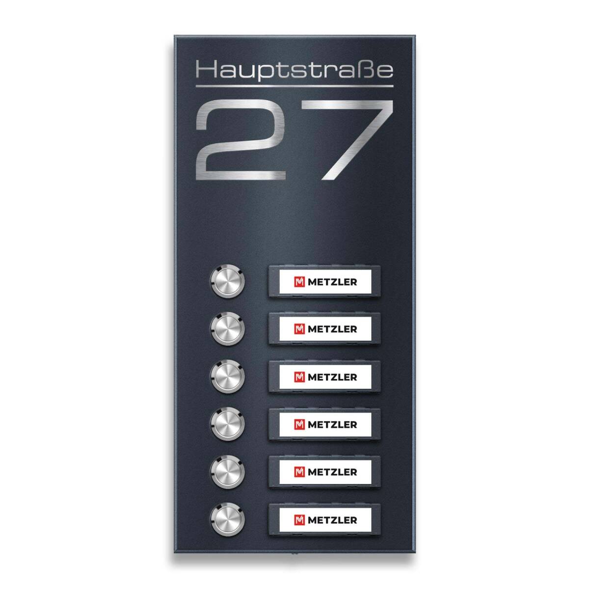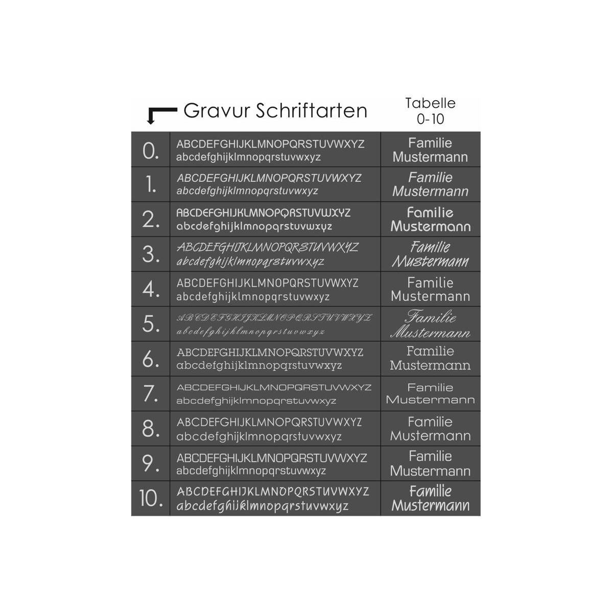 Die Klingel besticht zudem durch mehrere Highlights: für die edle Gravur Ihrer Straße und Hausnummer stehen Ihnen 20 verschiedene Schriftarten zur Verfügung. Die sechs Namensschilder sind besonders praktisch, da sie sich jederzeit austauschen lassen. Bei Mieterwechsel oder Namensänderung muss lediglich das Papier des Namensschilds getauscht werden, was durch das praktische Klick-System im Handumdrehen erledigt ist. Hierfür können Sie ganz einfach unsere interaktive Druckvorlage als ausfüllbares PDF nutzen.