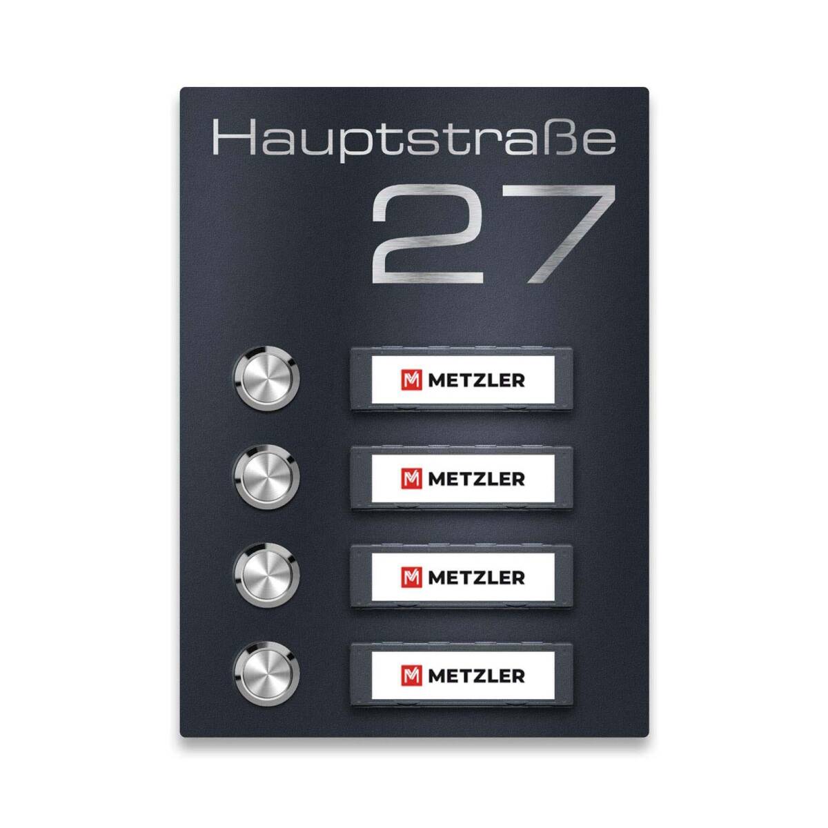 Die Klingel besticht zudem durch mehrere Highlights: für die edle Gravur Ihrer Straße und Hausnummer stehen Ihnen 20 verschiedene Schriftarten zur Verfügung. Die vier Namensschilder sind besonders praktisch, da sie sich jederzeit austauschen lassen. Bei Mieterwechsel oder Namensänderung muss lediglich das Papier des Namensschilds getauscht werden, was durch das praktische Klick-System im Handumdrehen erledigt ist. Hierfür können Sie ganz einfach unsere interaktive Druckvorlage als ausfüllbares PDF nutzen.