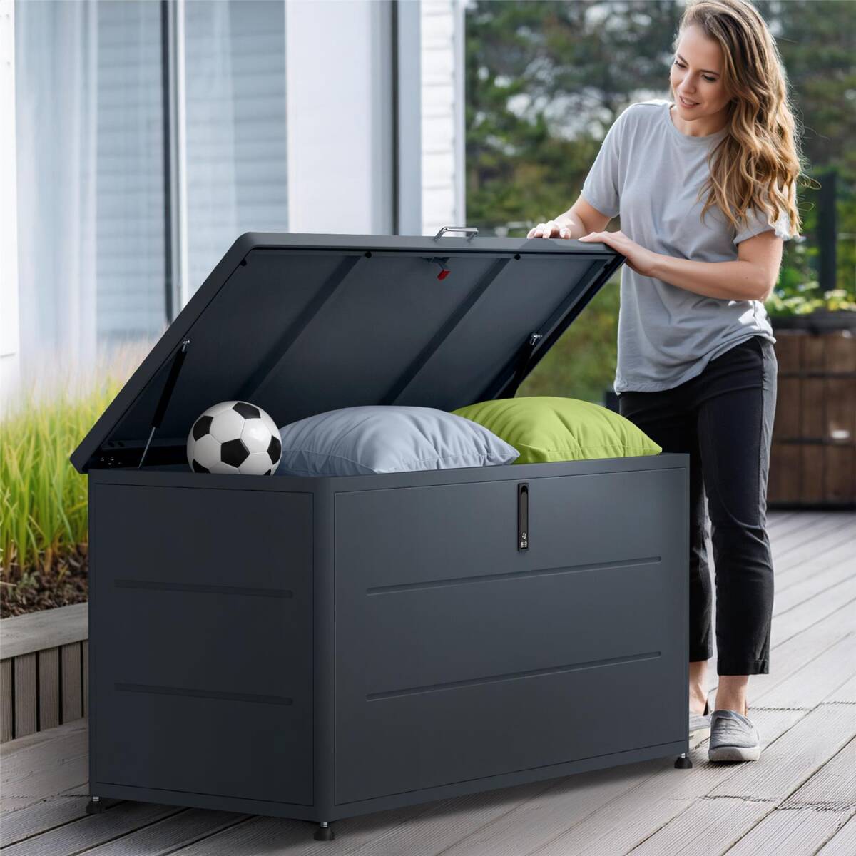 Mit ihrem großzügigen Innenraum bietet die Box ausreichend Platz für Gartenwerkzeuge, Kissen oder andere Utensilien. Der Deckel lässt sich dank eines integrierten Gasdruckdämpfers sanft öffnen und schließen, was die Benutzung besonders angenehm gestaltet.