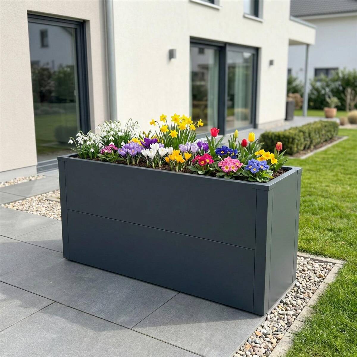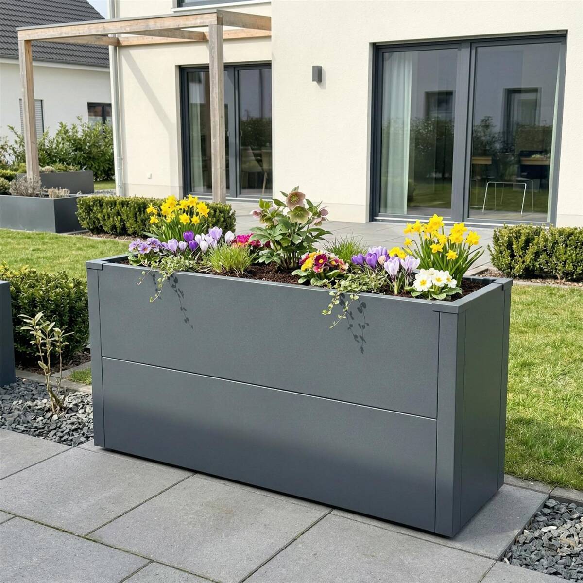 Die pulverbeschichtete Oberfläche in RAL 7016 Anthrazitgrau ist witterungsbeständig, pflegeleicht und bestens für den dauerhaften Außeneinsatz geeignet.