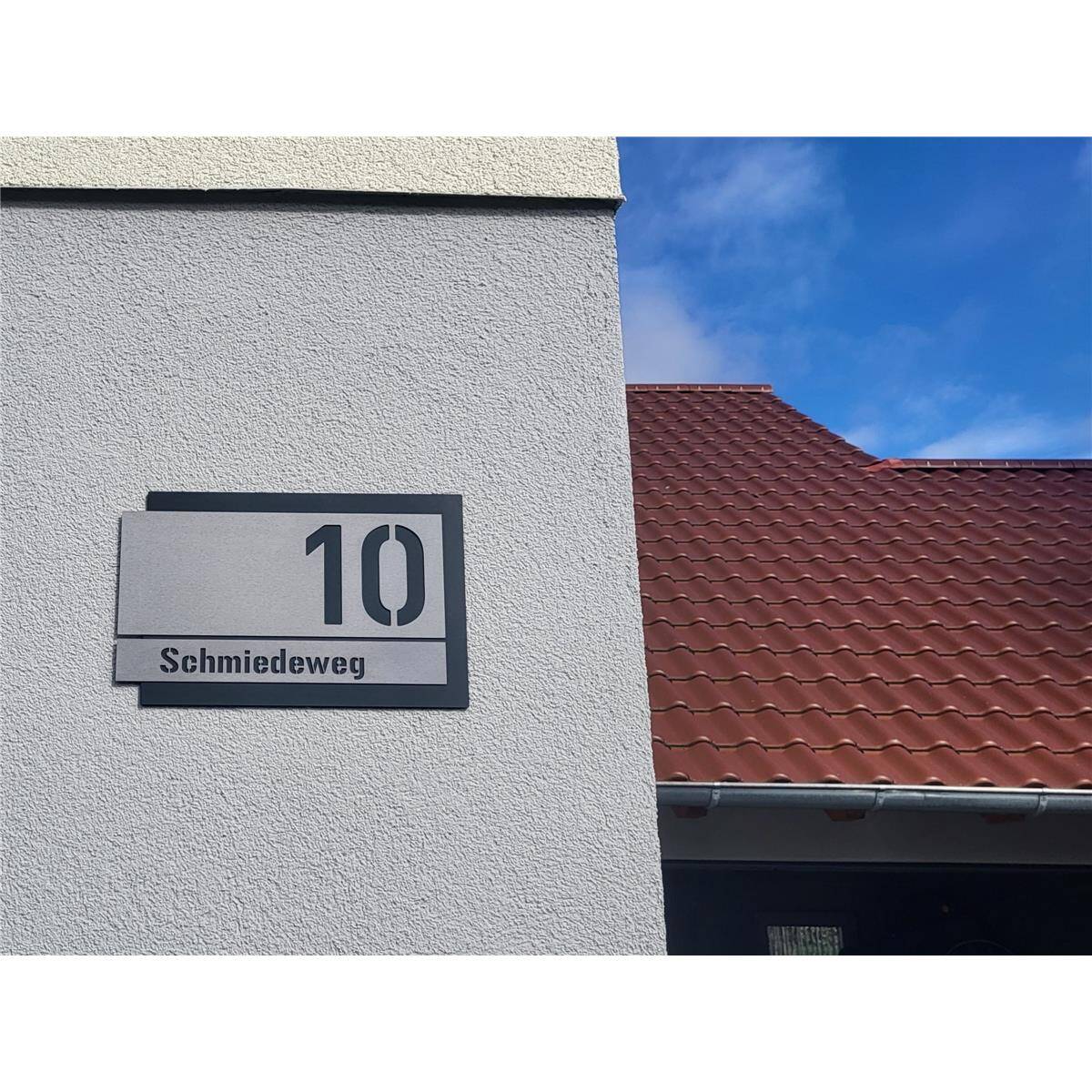 Die Grundplatte besteht aus hochwertigem Stahl, der zusätzlich in der Trendfarbe Anthrazit RAL 7016 pulverbeschichtet wird. Aus der Frontplatte, hergestellt aus rostfreiem V2A Edelstahl, wird Ihre Adresse hochpräzise ausgelasert. Durch die Kombination der zwei Platten entsteht ein schöner 3D-Effekt.