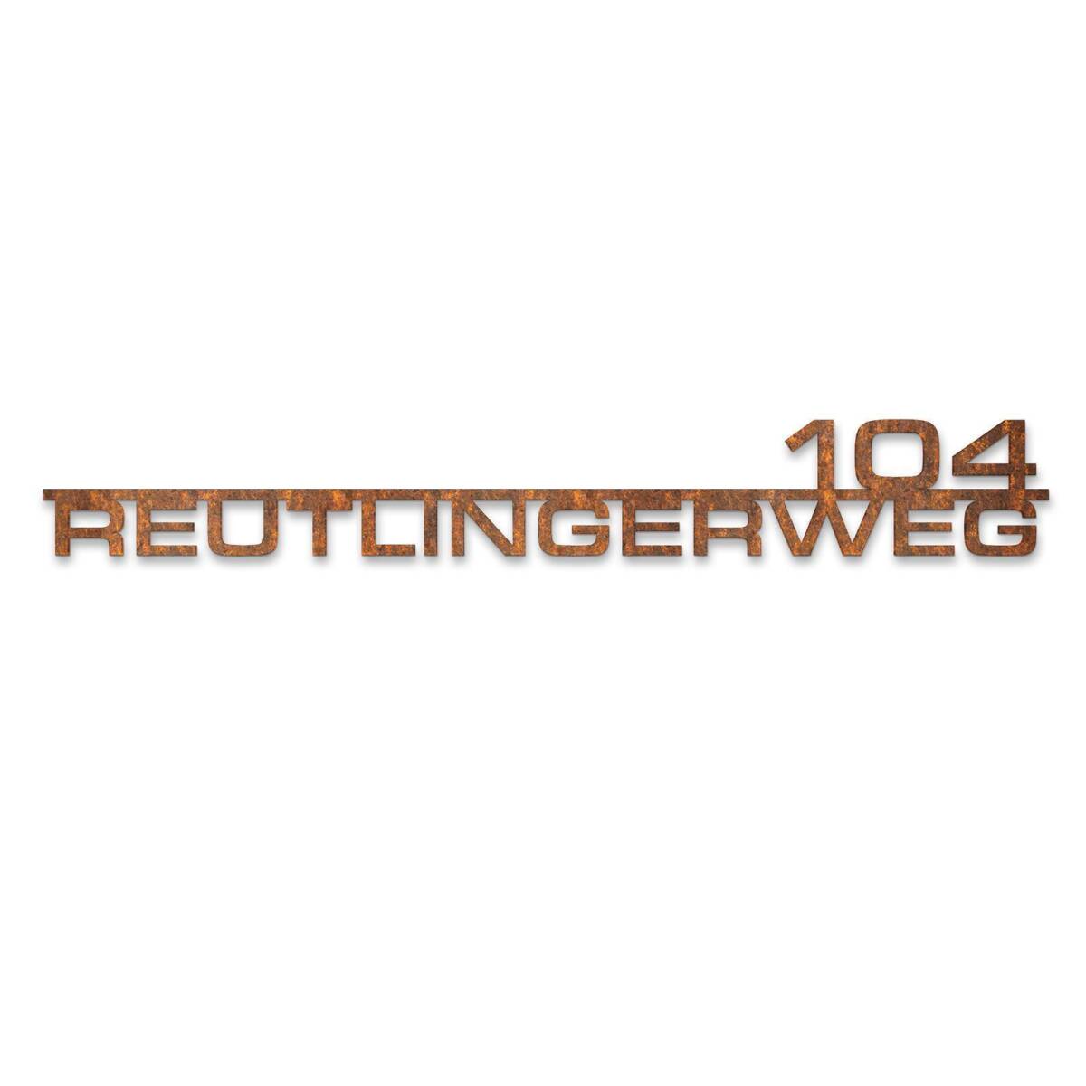 Lettrage de haute qualité en acier Corten, coupé par laser à haute précision. Le lettrage avec nom de rue et numéro de maison est véritable accroche-regard qui améliora chaque façade.