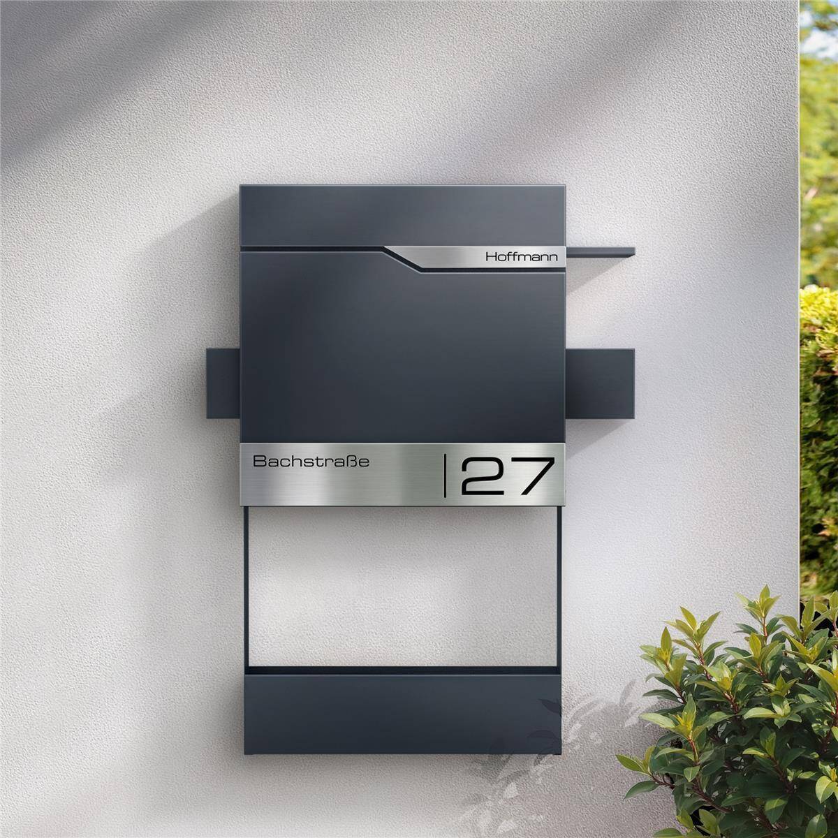 Realizzata in acciaio verniciato a polvere di alta qualità in Antracite, la Plate D non è solo elegante, ma anche particolarmente resistente agli agenti atmosferici. Con le sue dimensioni compatte di 80 x 80 mm e un'altezza di 30 mm, questo elemento si integra armoniosamente in ogni design di cassetta postale e dona un tocco personale all'ingresso.