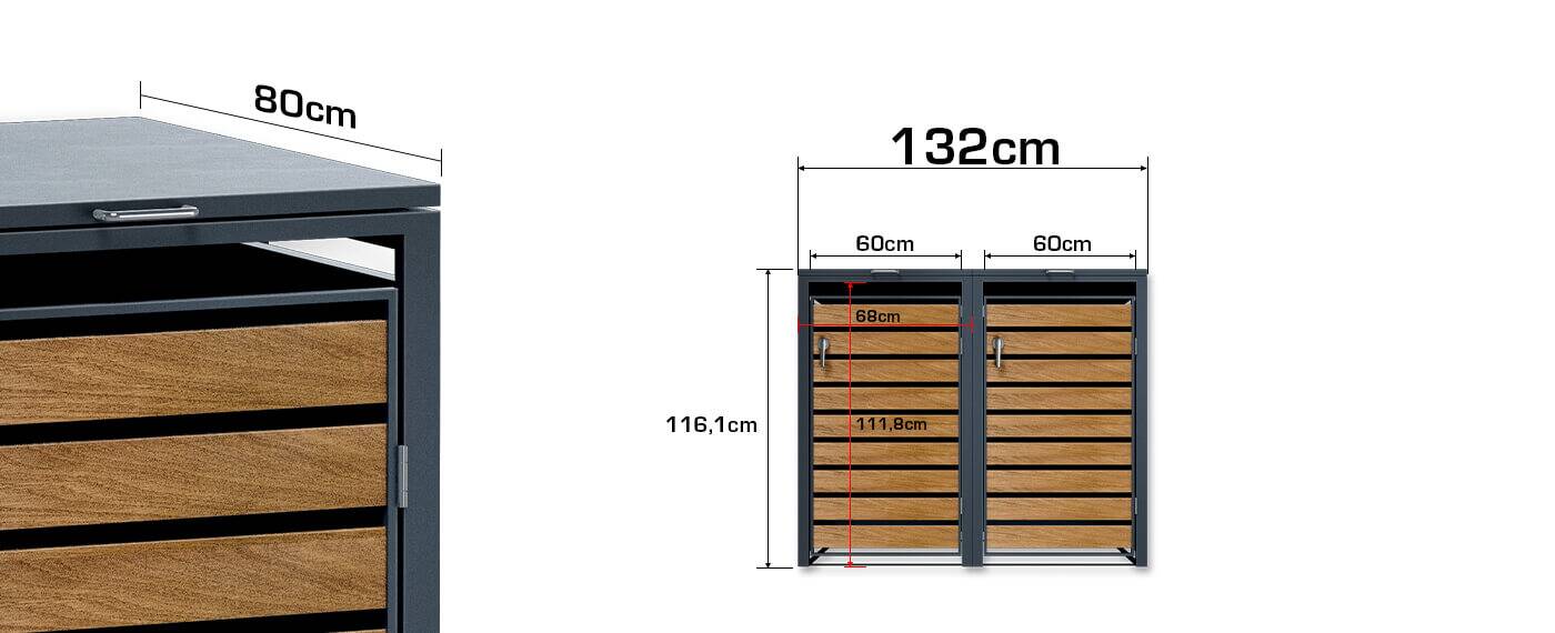 In die Mülltonnenboxen passen Abfallbehälter mit einem Volumen von bis zu 240 Litern. Bitte überprüfen Sie die Abmessungen Ihrer Mülltonne vorab, um sicherzustellen, dass sie in die Box passt.