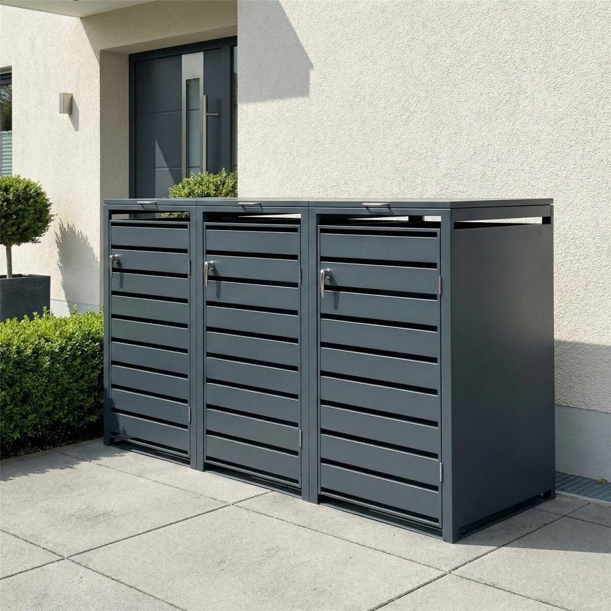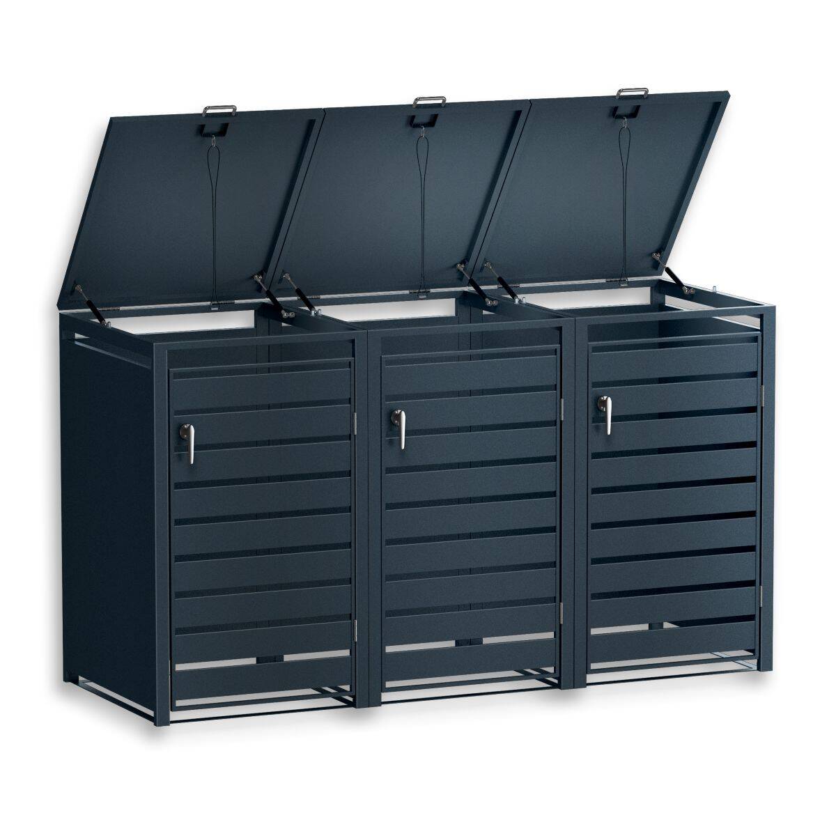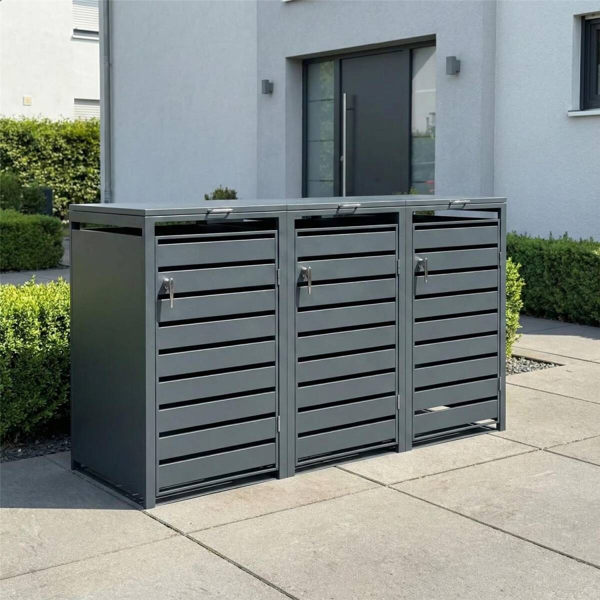 Metzler Mülltonnenbox aus witterungsbeständig pulverbeschichtetem Stahl mit praktischem Automatikdeckel für 3 Mülltonnen mit 60-240 Liter Fassungsvermögen
