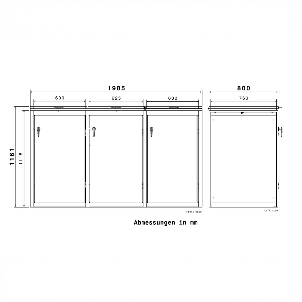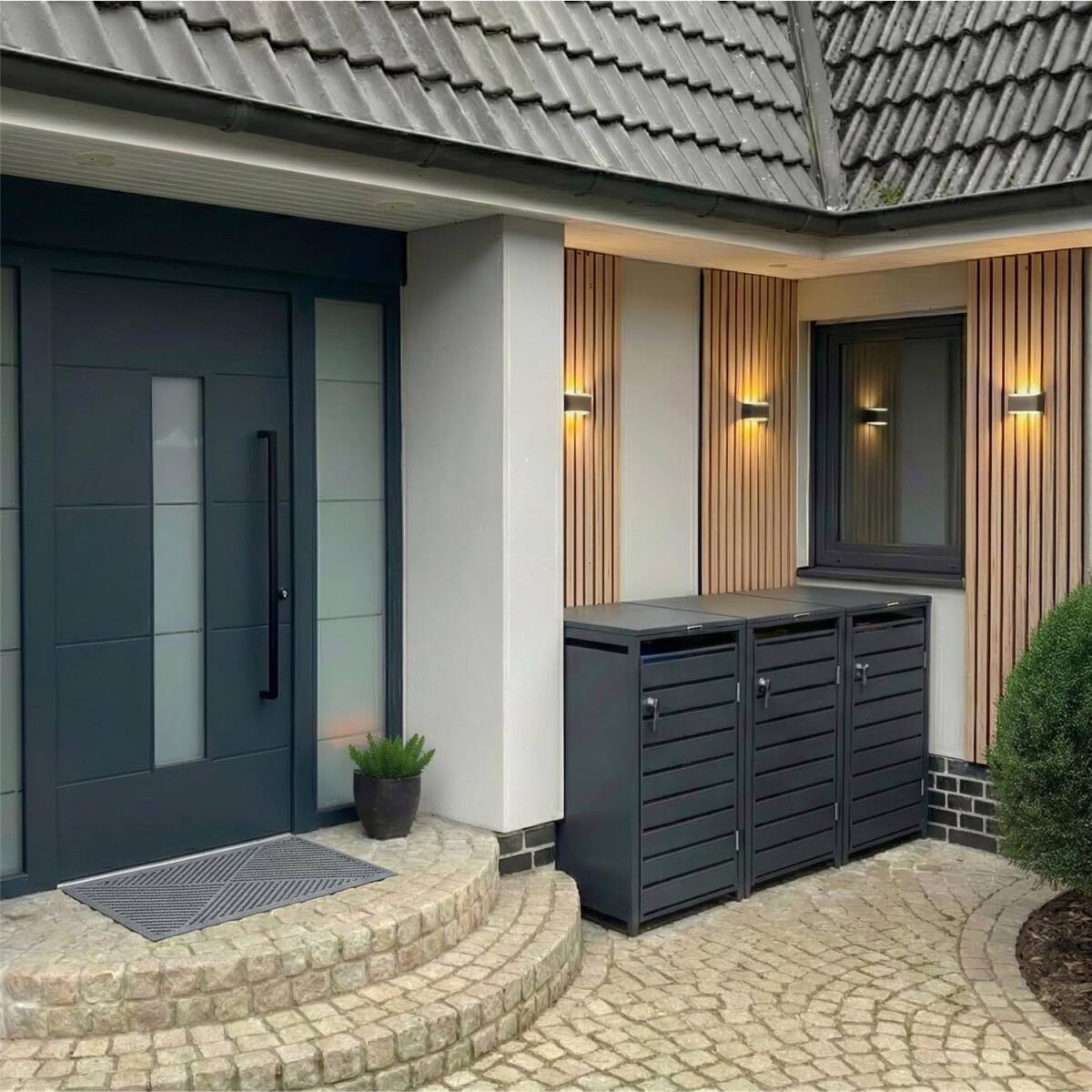 Dank der Pulverbeschichtung in mattem Anthrazitgrau RAL 7016 sind die Mülltonnenboxen vor jeglichen Witterungseinflüssen wie UV-Strahlen, Regen und Schnee geschützt. Zudem fügt sich der Farbton ideal in Ihren modernen Eingangsbereich hinein.