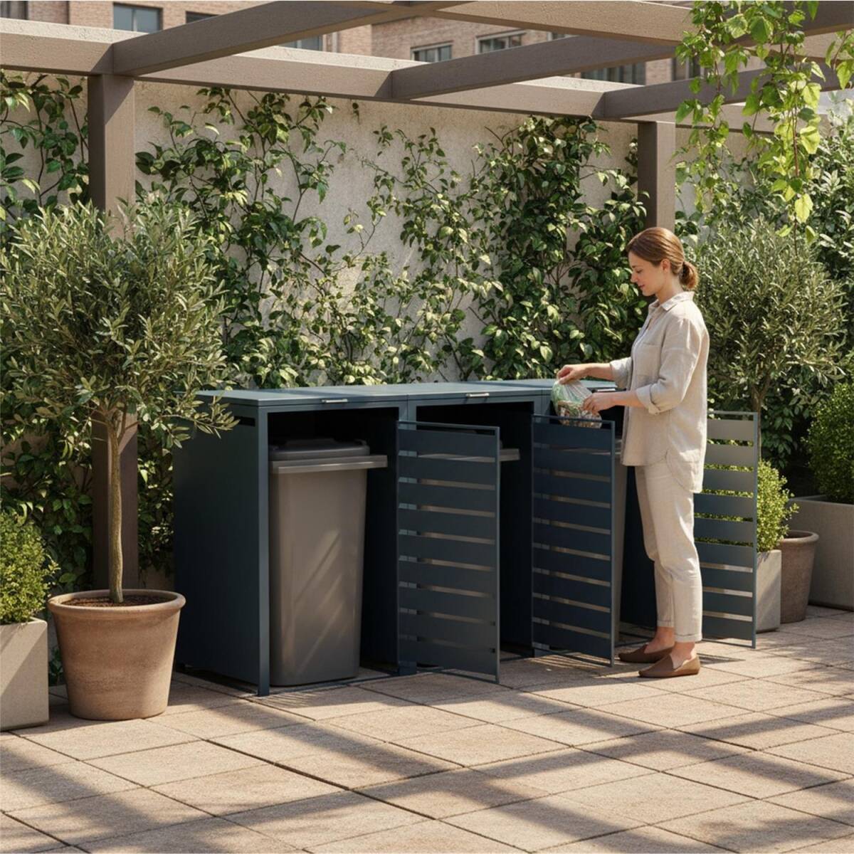 Schluss mit unansehnlichen Mülltonnen, die Ihren Eingangsbereich verschändeln! Werten Sie Ihren Außenbereich mit den praktischen Mülltonnenboxen auf. Die smarte und komfortable Lösung sorgt für Ordnung und Sauberkeit auf Ihrem Grundstück und schützt Ihre Mülltonnen gleichzeitig vor Witterung, Tieren und Vandalismus.