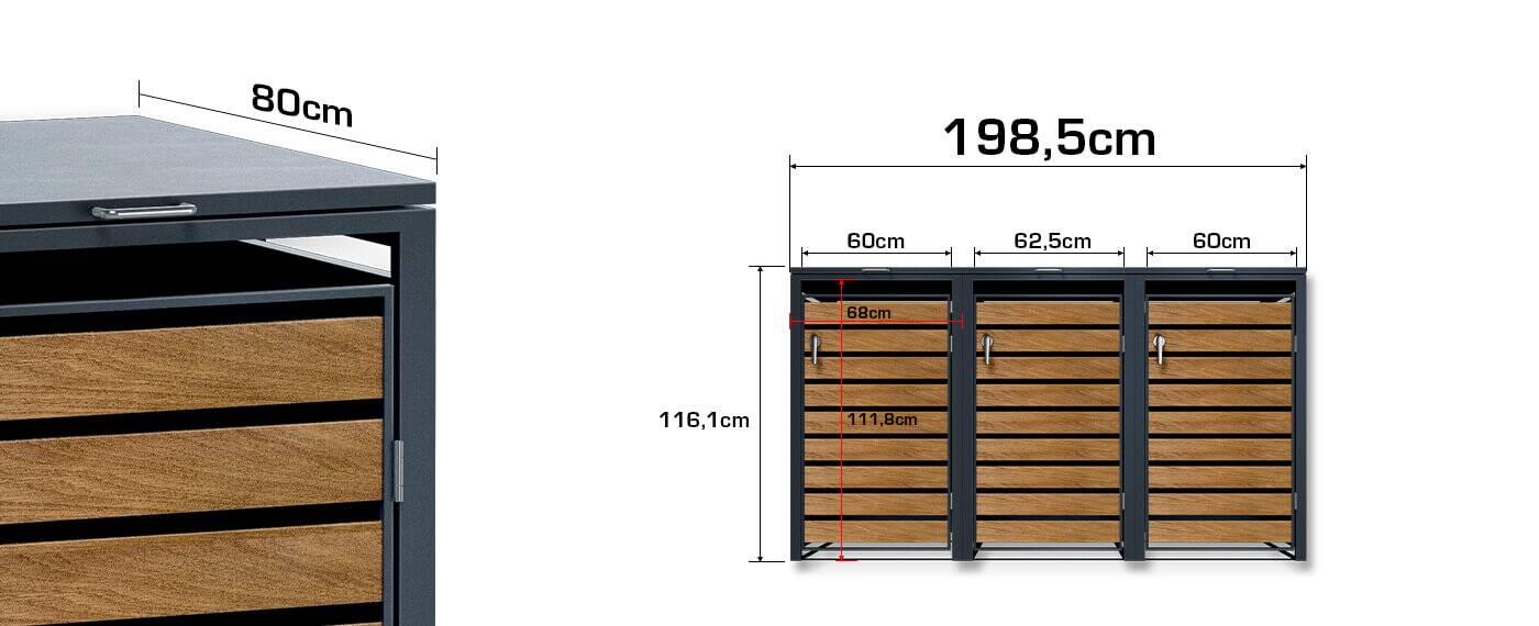 In die Mülltonnenboxen passen Abfallbehälter mit einem Volumen von bis zu 240 Litern. Bitte überprüfen Sie die Abmessungen Ihrer Mülltonne vorab, um sicherzustellen, dass sie in die Box passt.