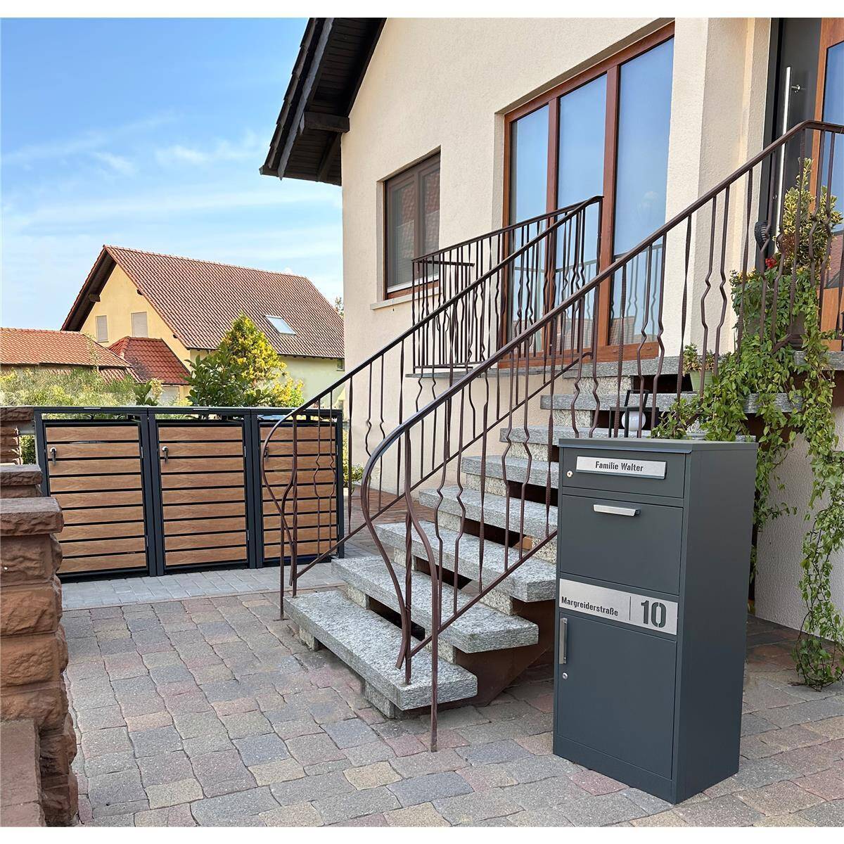 Dank der Pulverbeschichtung in mattem Anthrazitgrau RAL 7016 sind die MĂĽlltonnenboxen vor jeglichen WitterungseinflĂĽssen wie UV-Strahlen, Regen und Schnee geschĂĽtzt. Zudem fĂĽgt sich der Farbton ideal in Ihren modernen Eingangsbereich hinein.