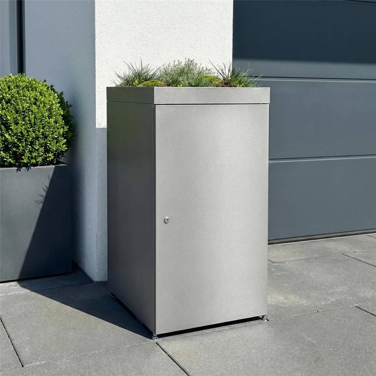 Oberhalb der Mülltonnenbox befindet sich eine Pflanzwanne, die Sie individuell begrünen können. Überflüssiges Wasser läuft hierbei durch den integrierten Wasserablauf ab. Ein Highlight für Ihren Eingangsbereich, mit dem Sie positiv zum Klima beitragen!