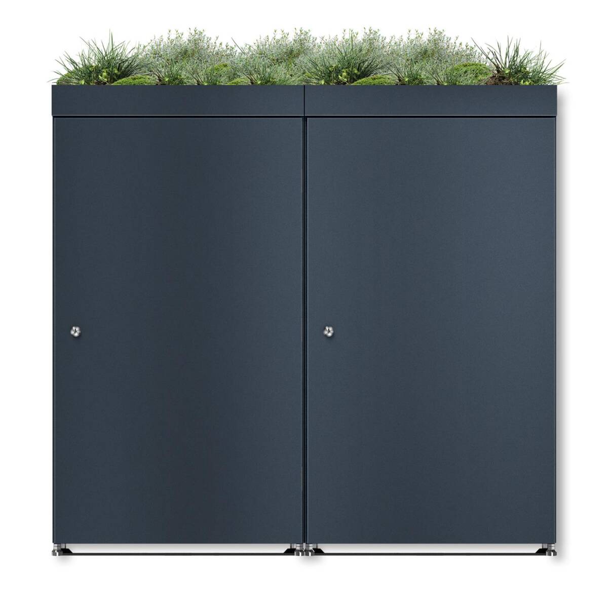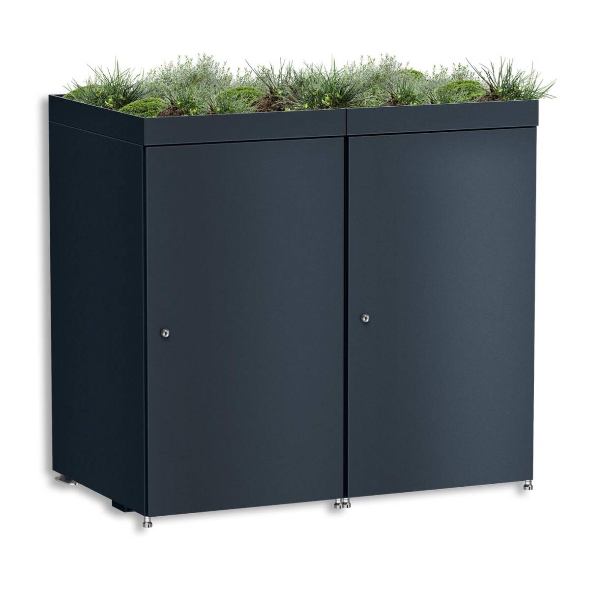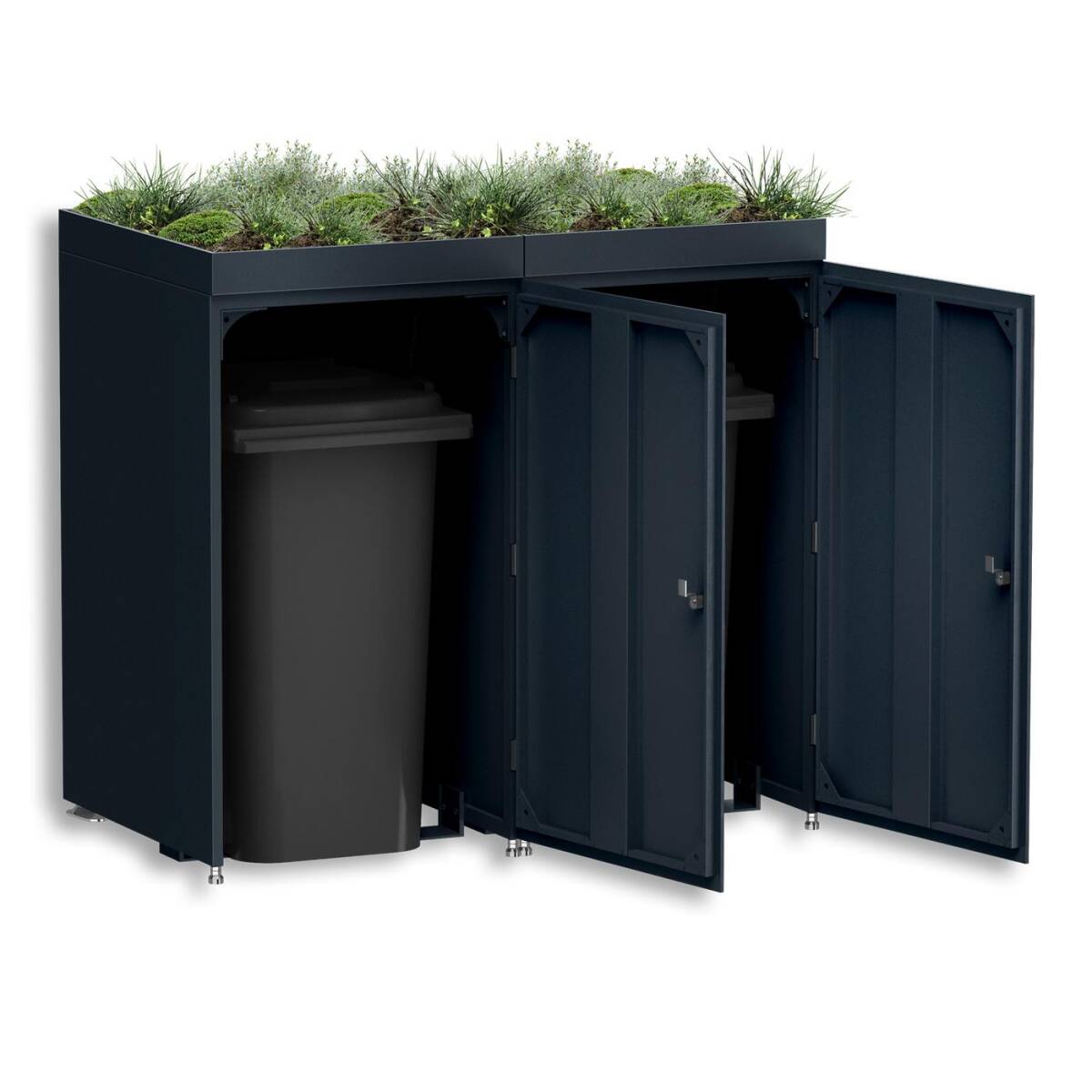 Mülltonnenbox mit Pflanzdach für zwei Tonnen mit höhenverstellbaren Füßen von Metzler