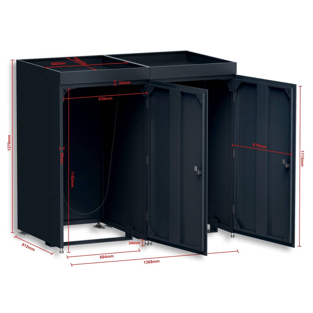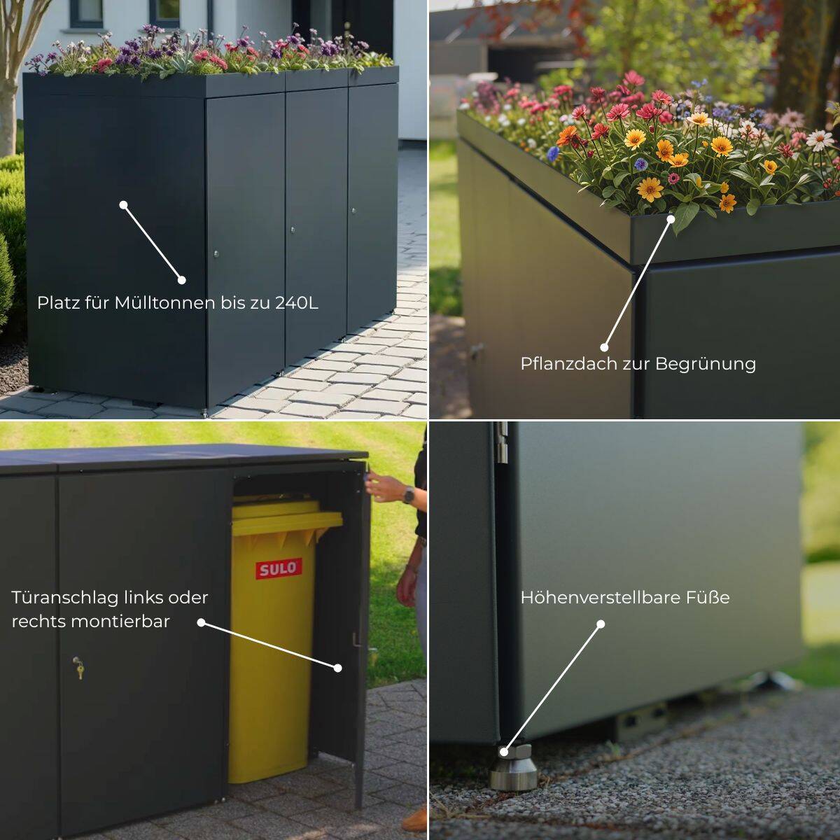 - Platz für zwei Mülltonnen bis 240 L - Passend für alle gängigen Tonnengrößen
