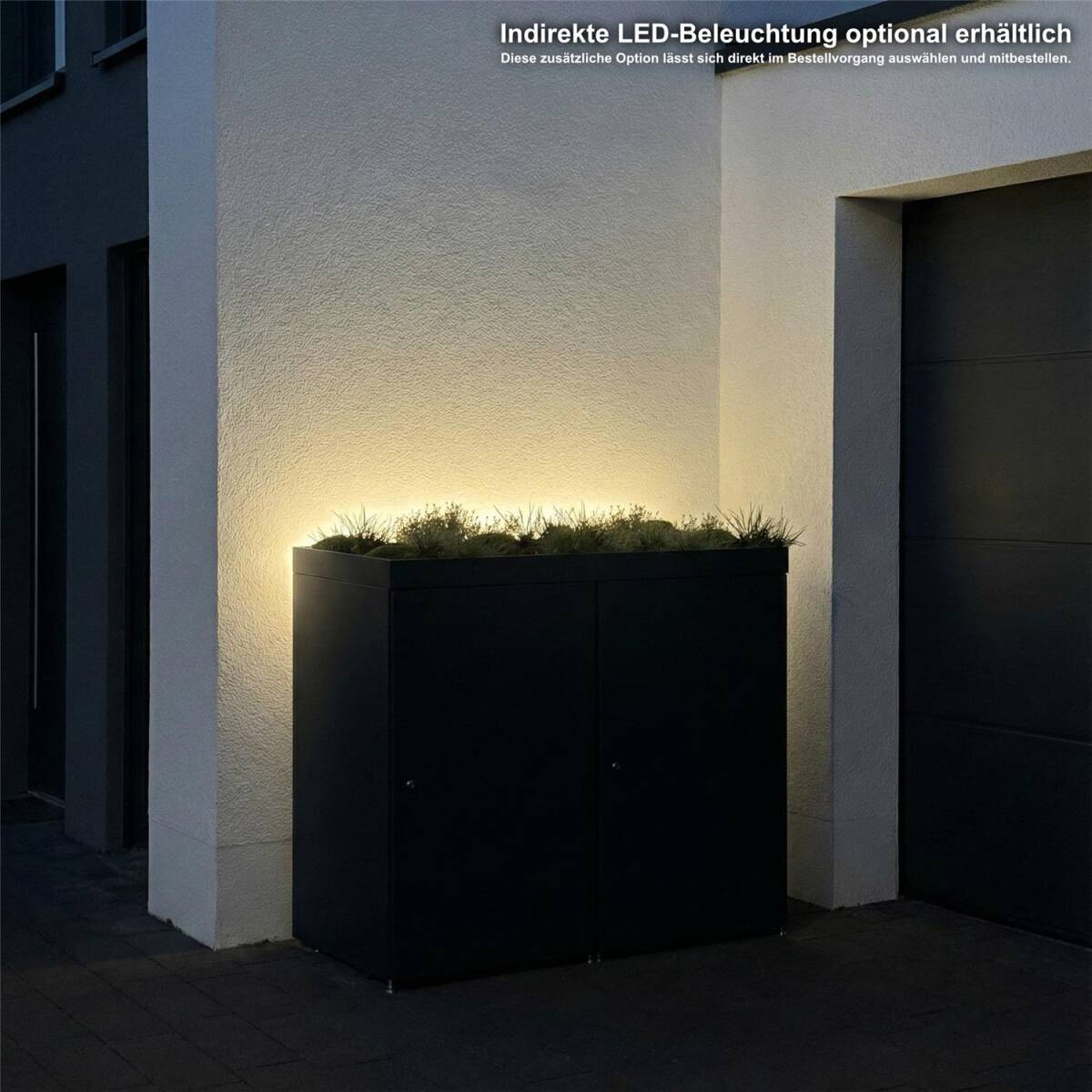 Oberhalb der Mülltonnenbox befindet sich eine Pflanzwanne, die Sie individuell begrünen können. Überflüssiges Wasser läuft hierbei durch den integrierten Wasserablauf ab. Ein Highlight für Ihren Eingangsbereich, mit dem Sie positiv zum Klima beitragen!