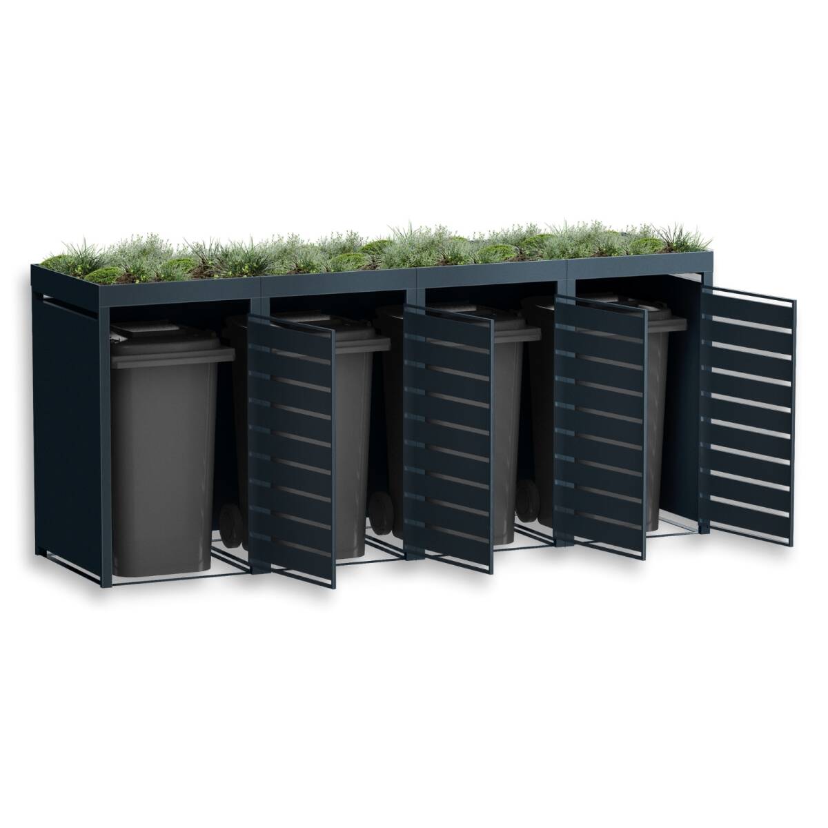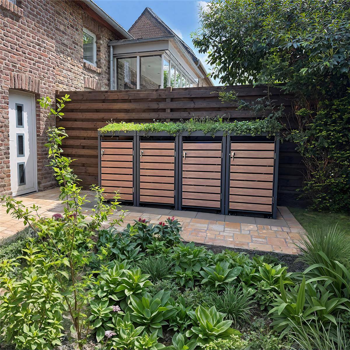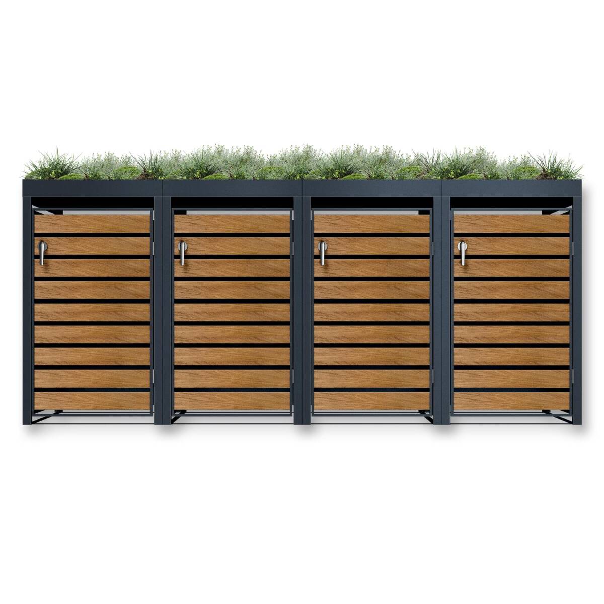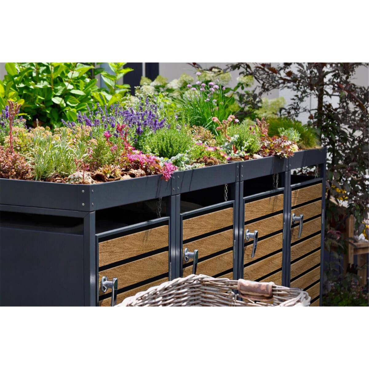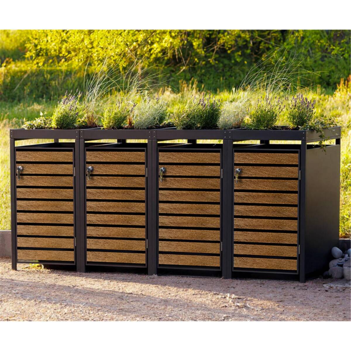 Metzler Mülltonnenbox in Holzoptik aus witterungsbeständig pulverbeschichtetem Stahl mit Pflanzdach für 4 Mülltonnen mit 60-240 Liter Fassungsvermögen